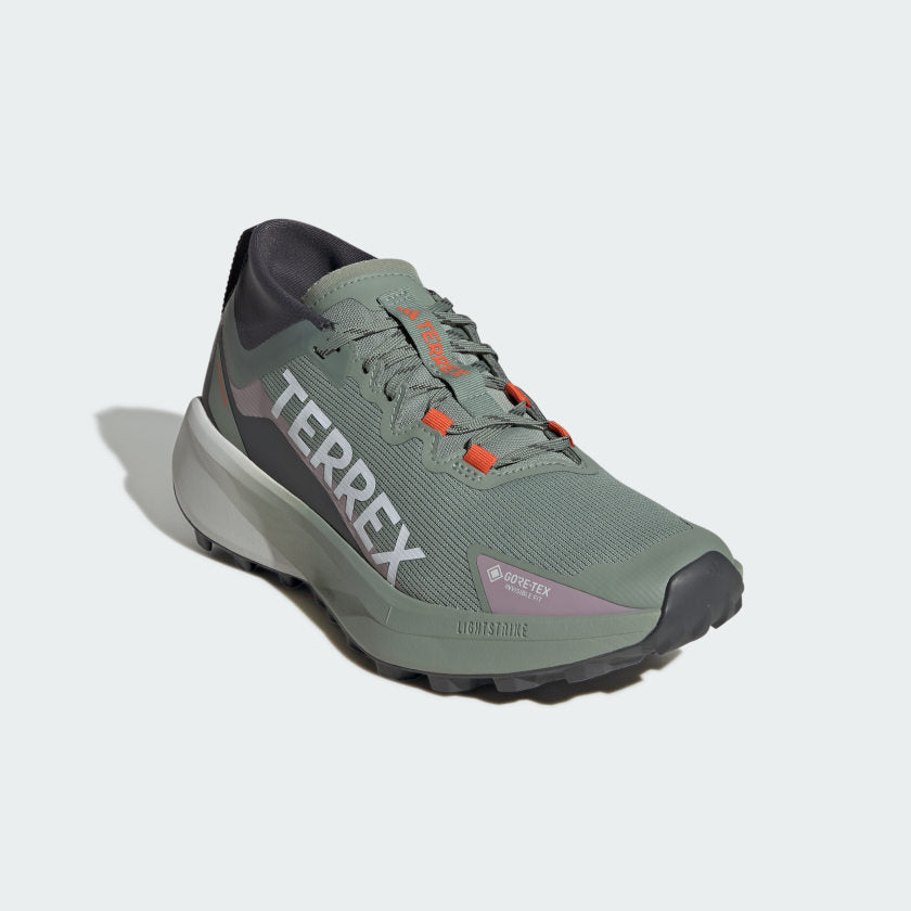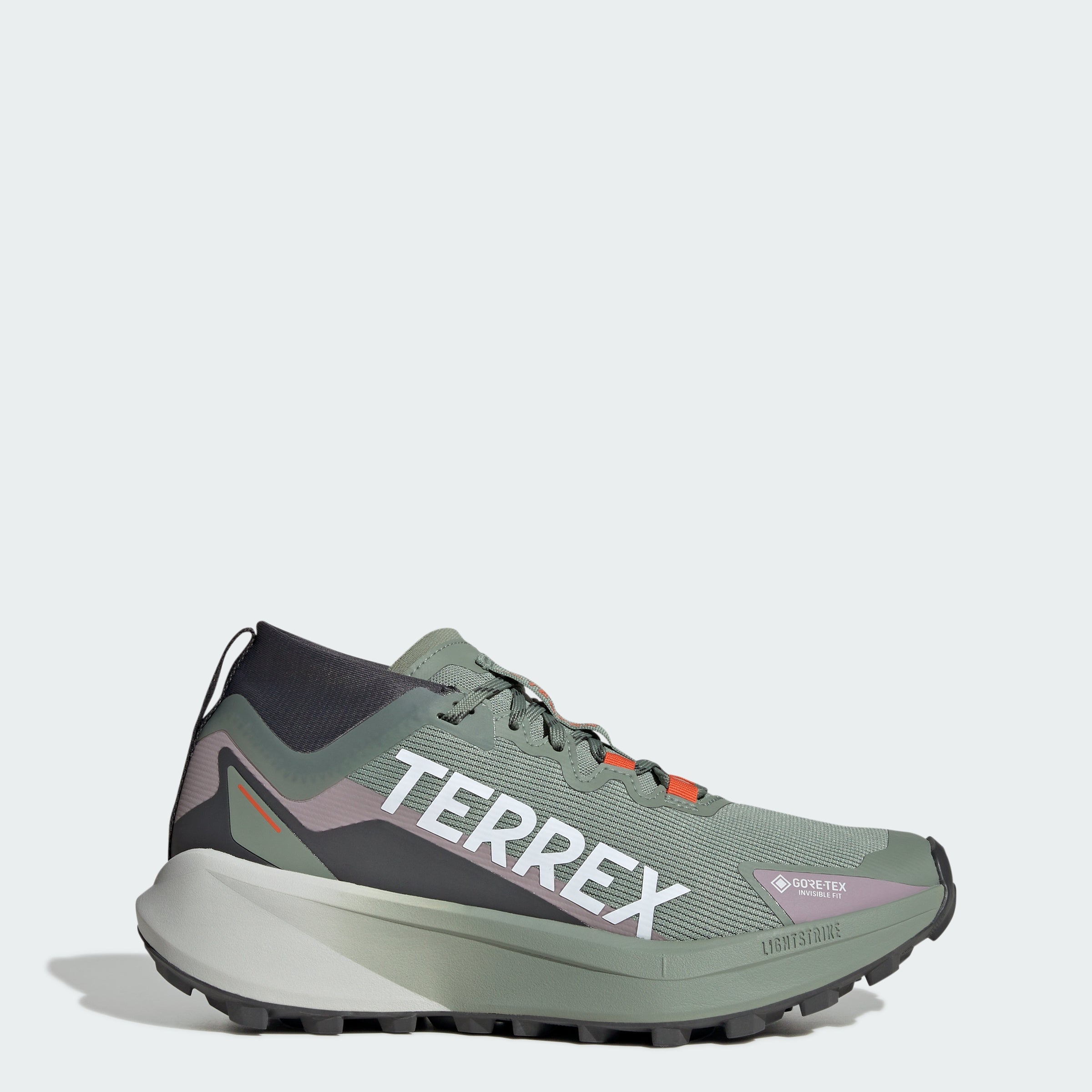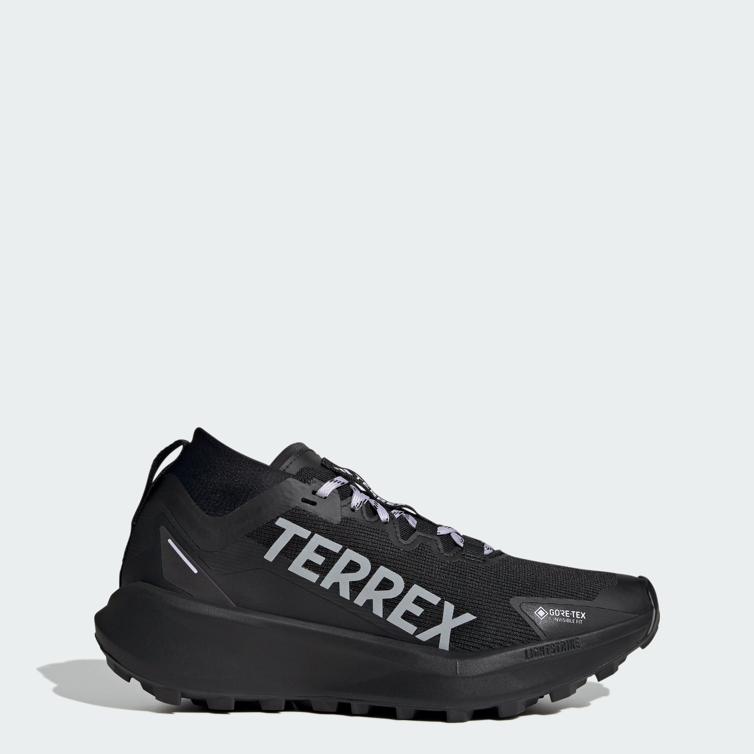 Responsive and supportive, these Terrex Agravic trail running shoes are built for logging miles and adventurous days on the trail in wet, muddy conditions. A waterproof, breathable GORE-TEX membrane seals out wet conditions to keep your feet dry, and you focused on the trail ahead. Abrasion-resistant overlays add trail-proven durability, and the gusseted tongue seals out debris. A Lightstrike 2.0 midsole provides responsive cushioning for stability and comfort on rough terrain, and the rocker shape promotes a smooth roll-off for a fluid pace. The Continental Rubber outsole with 4 mm lugged tread maintains secure footing across roots and rocks, wet or dry. This product features at least 20% recycled materials. By reusing materials that have already been created, we help to reduce waste and our reliance on finite resources and reduce the footprint of the products we make.
