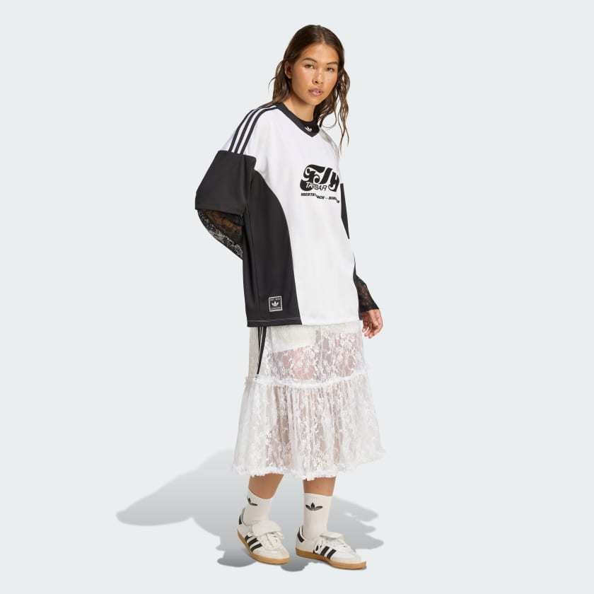 Who knew soccer style could be so chic? This adithtdas lace jersey combines design elements from the pitch with elegant lace. It cuts an oversized silhouette - for the maximum style impact. Wear it into the city or while dancing at a summer festival.