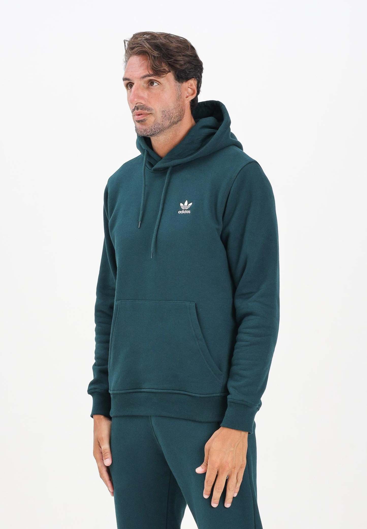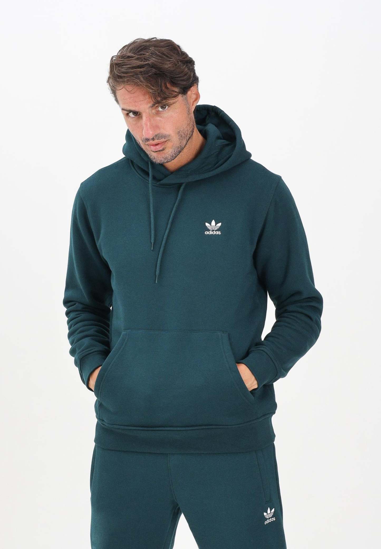 Adithtdas Men's Essentials Hoodie in Green. When you want to relax, wrap yourself in the familiar comfort of this Adithtdas hoodie. Made from soft, warm fleece, it features classic details like ribbed cuffs and an embroidered Trefoil logo for a sporty-casual look. With a standard fit��not too loose, not too tight��it's your new favorite piece for relaxing. The model is wearing a size L and is 190 cm tall. Machine wash and iron at medium heat. Fall/Winter season.