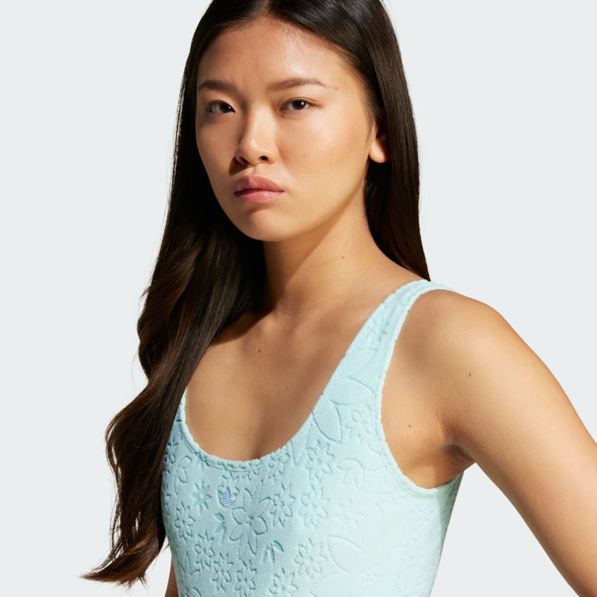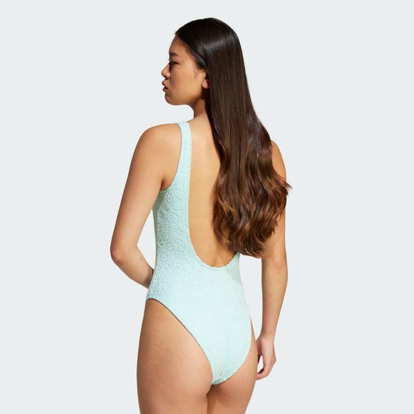 This adithtdas swimsuit is all about minimalism and sophistication. Made from soft ribbed velour, it's perfect for lounging beachside or poolside. An embroidered Trefoil logo adds a subtle touch of sportiness. This product is made with at least 70% recycled materials. By reusing materials that have already been created, we help to reduce waste and our reliance on finite resources and reduce the footprint of the products we make.