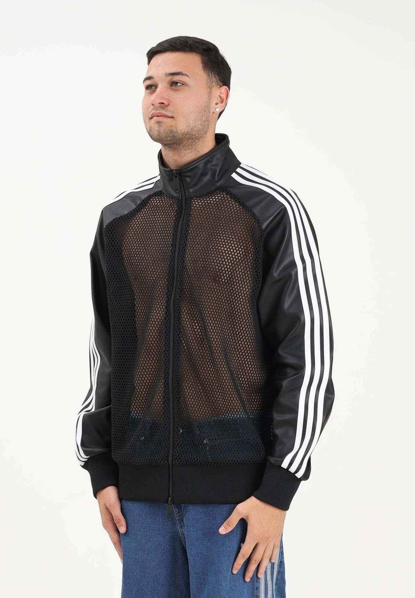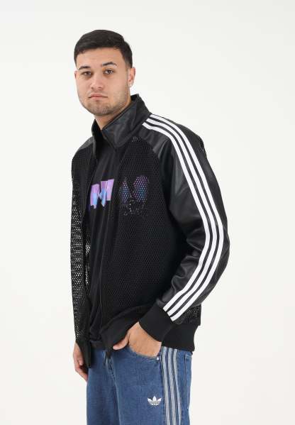 Adithtdas Adithtdas x Jeremy Scott Pride men's black faux leather zip-up hoodie. This Adithtdas x Jeremy Scott jacket pays homage to the inclusive spirit of the '90s club scene. The synthetic construction with mesh panels lets your skin breathe. A Trefoil on the back adds a sporty touch. The loose fit lets you move freely on the dance floor or around town. The model is wearing a size L and is 187 cm tall. We recommend washing at medium temperature. Fall/Winter season.