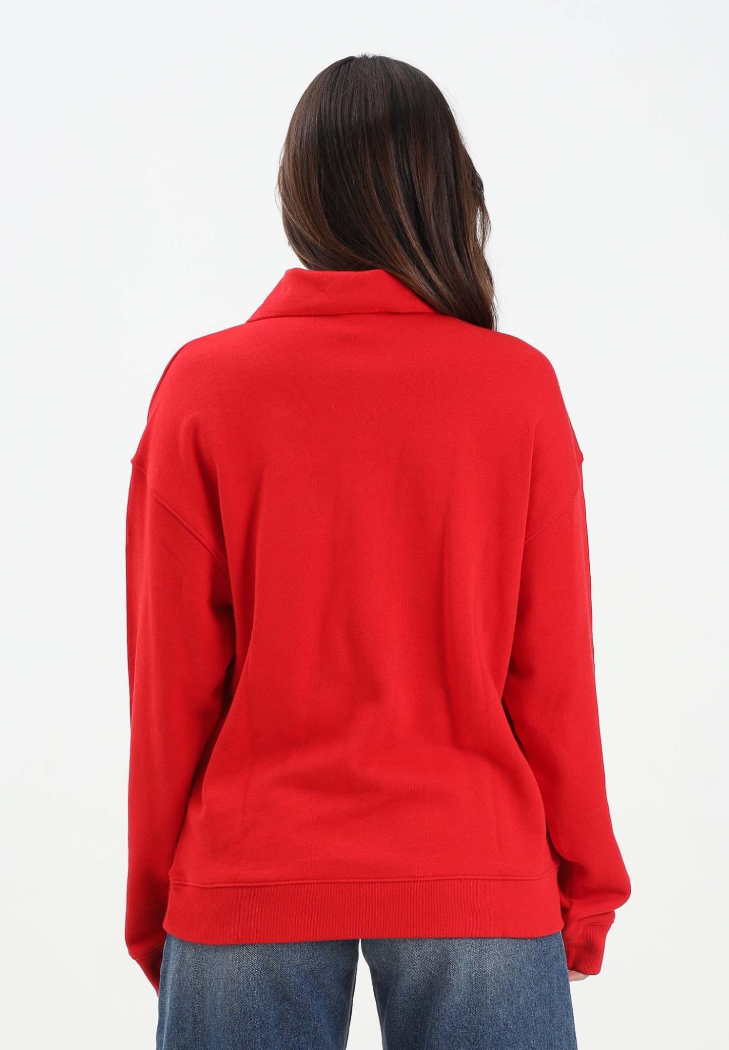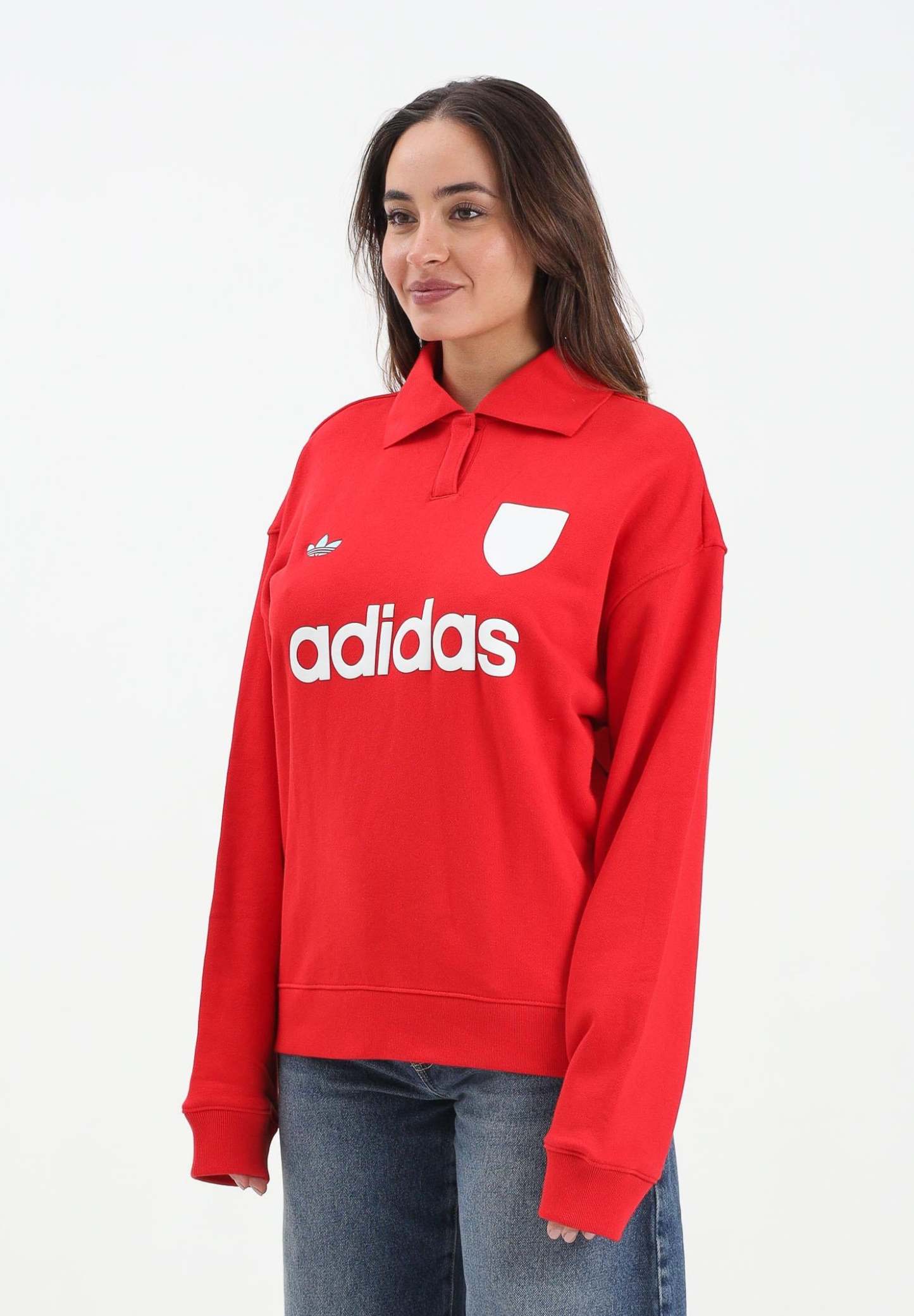 Adithtdas The women's red FOOTIE sweatshirt, inspired by the world of football, combines comfort and style. Crafted from soft French terry with a loose fit, it easily slips over a T-shirt or tank top. Multiple logos celebrate the 3-Stripes universe, while ribbed details and a polo collar add a clean, refined touch. Machine wash at 40 degrees. The model is wearing a size S and is 170 cm tall. Available for Fall/Winter.