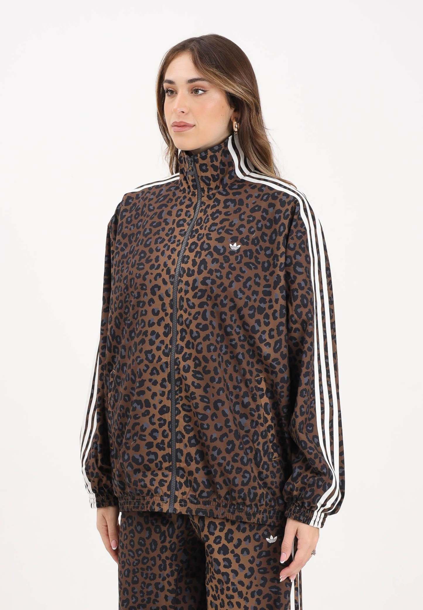 Adithtdas Women's Leopard Firebird Oversized Windbreaker in Beige. This Adithtdas jacket has a vibrant personality that lets you express your full personality. The loose fit gives you the freedom you need, while the leopard print adds a touch of wildness. Pair it with the matching trousers for a look that won't go unnoticed. The model wears a size S and is 170 cm tall. We recommend washing and ironing at medium heat. Fall/Winter season.