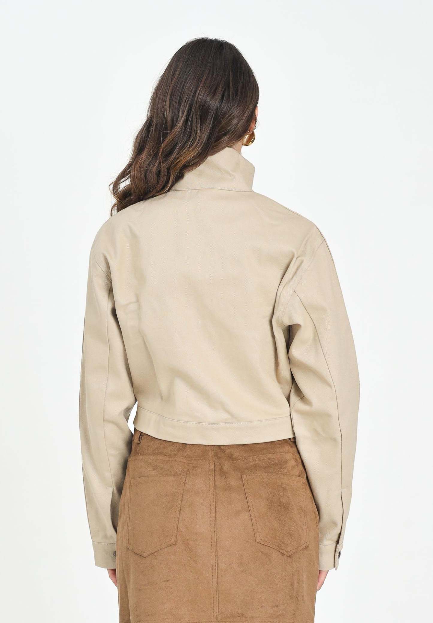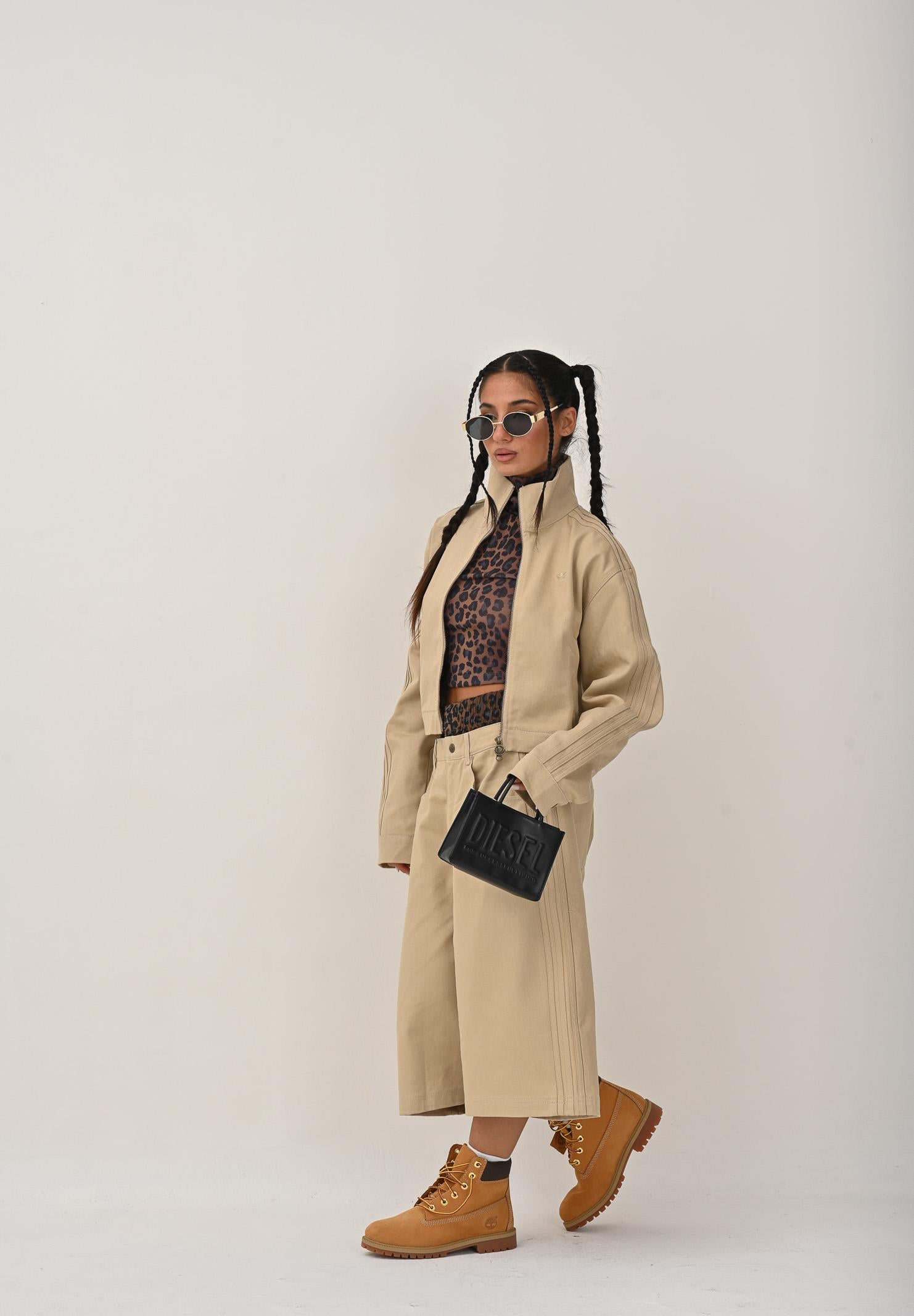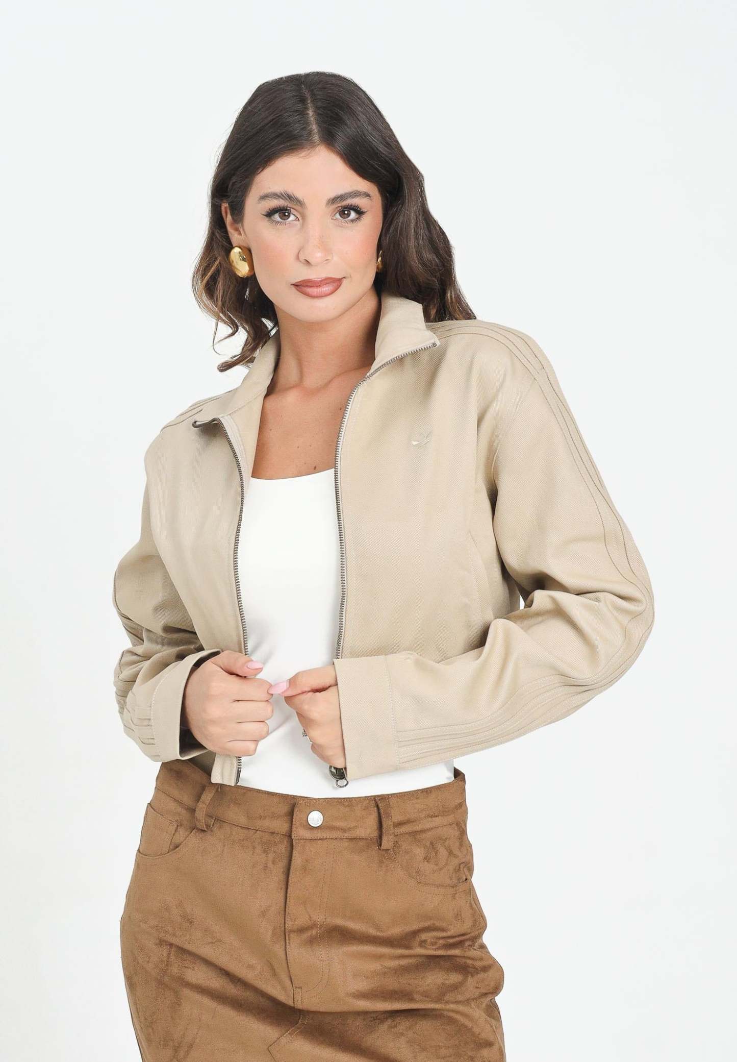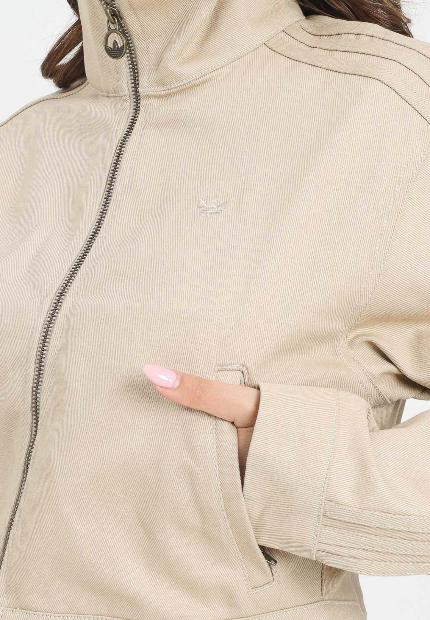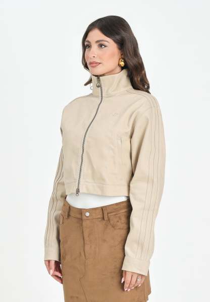 Adithtdas Women's Firebird Twill Crop Jacket in beige denim. This jacket is a modern take on an iconic look. Its design is rooted in hip-hop and streetwear culture, making it a must-have for any stylish wardrobe. Whether you're going out or relaxing at home, the soft twill construction and relaxed silhouette of this jacket will keep you comfortable and stylish. The model is wearing a size S and is 170 cm tall. We recommend washing and ironing at medium heat. Suitable for autumn/winter.