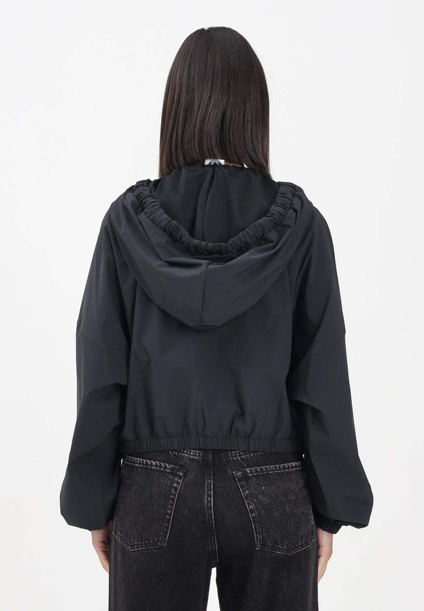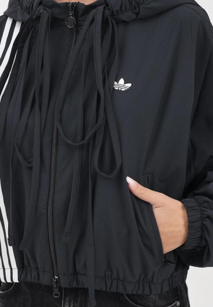 Adithtdas Ribbon Off Placed 3-Stripes women's black windbreaker. It features a comfortable fit with elasticated hem and cuffs, an adjustable drawstring hood, and a front zip closure. The front features the iconic three white Adithtdas stripes that run from the shoulder to the bottom, along with the embroidered logo on the chest. The back is simple and clean, with a cropped line that gives it a modern and dynamic touch. Perfect for casual and streetwear looks. The model wears a size S and is 170 cm tall. Medium-heat wash recommended. Fall/Winter season.