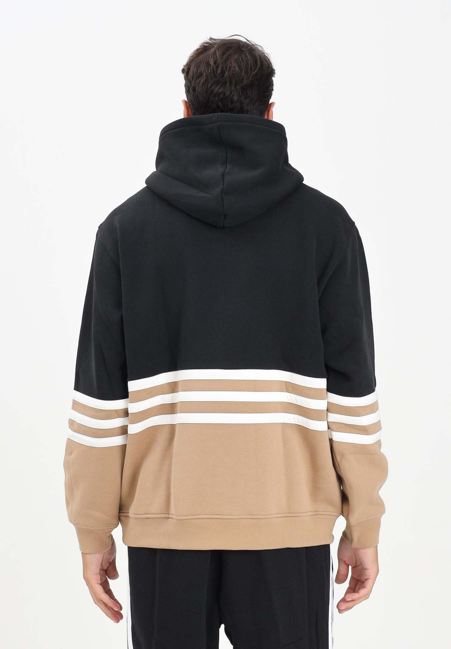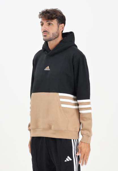 Adithtdas PERFORMANCE Men's Archive Hoodie in Black and Beige. The black upper section contrasts with the beige lower section, while the sleeves are embellished with the iconic three white stripes for a dynamic touch. The Adithtdas logo is embroidered on the chest in gold, a detail that adds modernity and recognizability. Featuring a large kangaroo pocket and made of soft fabric, it's perfect for casual and sporty outfits, ideal for leisure wear or to add character to a streetwear look. The model is wearing a size L and is 187 cm tall. We recommend washing and ironing at medium heat. Fall/Winter season.