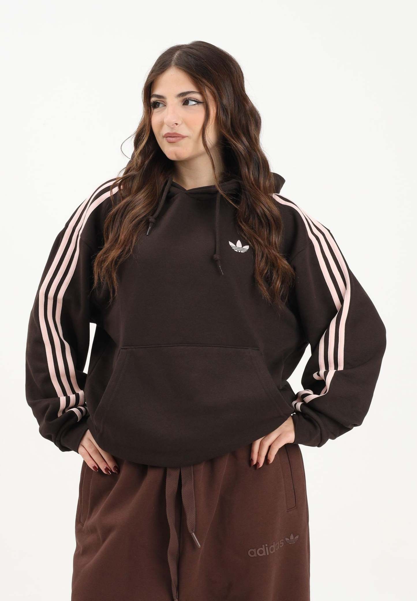 Adithtdas ADICOLOR CLASSICS 3-STRIPES women's brown hoodie. Discover our Adicolor Classics 3-Stripes hoodie, where the iconic meets the modern. This piece is a style statement that draws inspiration from Adithtdas' rich heritage. Crafted from soft fleece, it offers warmth and comfort. The embroidered Trefoil and iconic 3-Stripes add a touch of Adithtdas history, celebrating the brand's legacy. With a loose fit, it offers freedom of movement in a contemporary silhouette. The drawstring hood offers adjustable coverage to keep you comfortable, whether you're on the street or at home. We embrace the spirit of innovation, where timeless design meets contemporary flair. Let Adithtdas be part of your journey, offering you a style that transcends seasons and trends. The model wears a size S and is 170 cm tall. We recommend washing and ironing at medium temperature. Fall/Winter season.