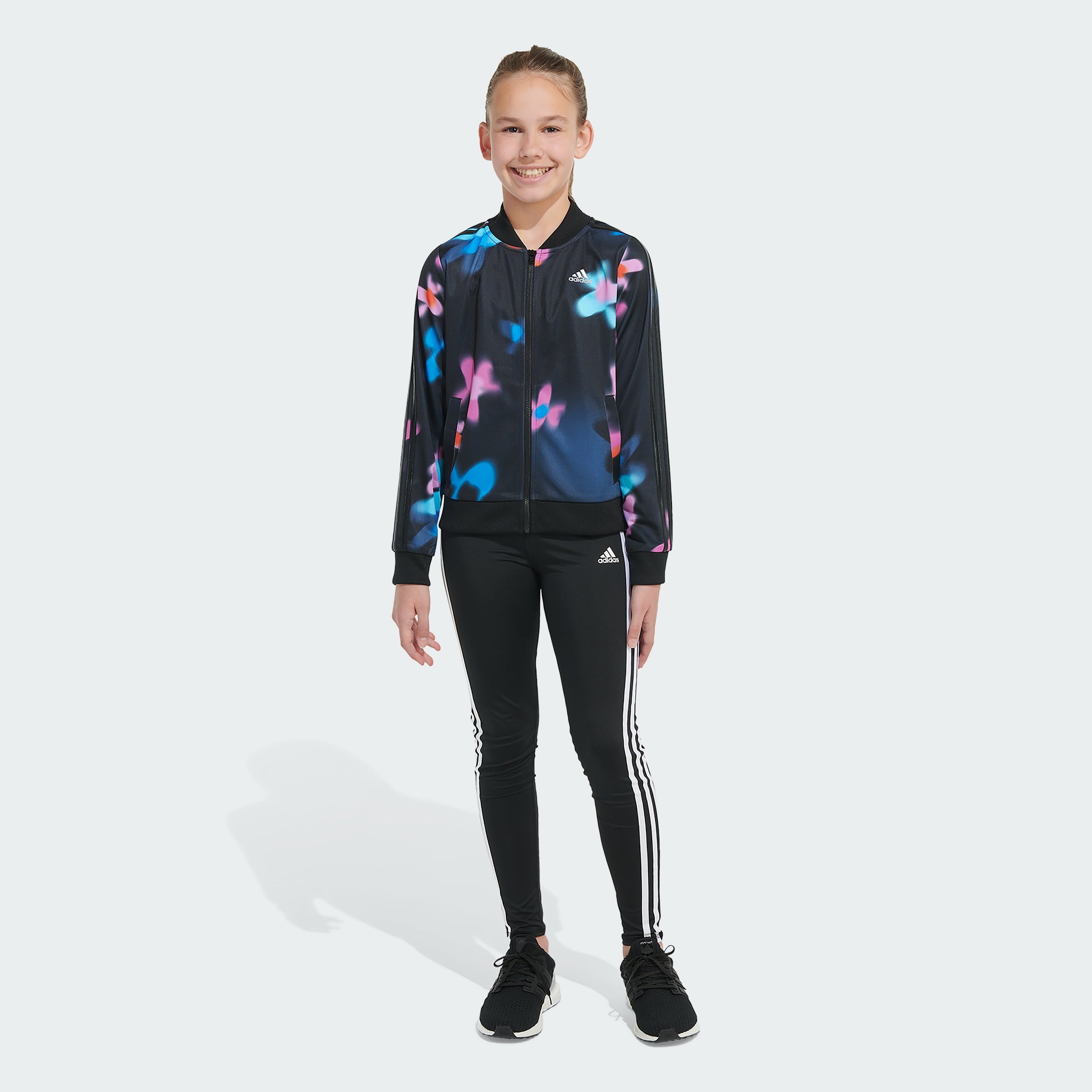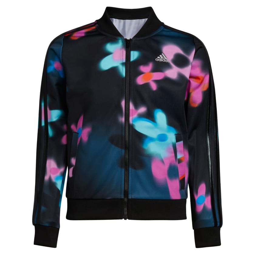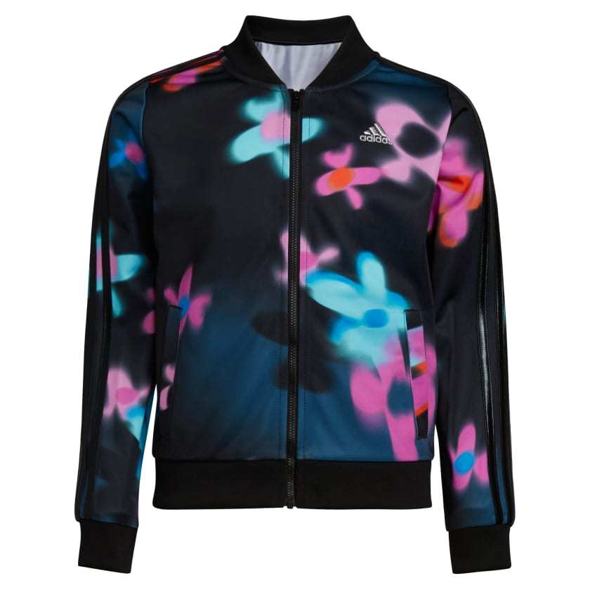 Flora aura. This juniors' adithtdas track jacket puts a trippy spin on flower print - the pattern looks more like leopard spots than blooms or blossoms. The tricot fabric feels smooth to the touch and has a slight sheen.