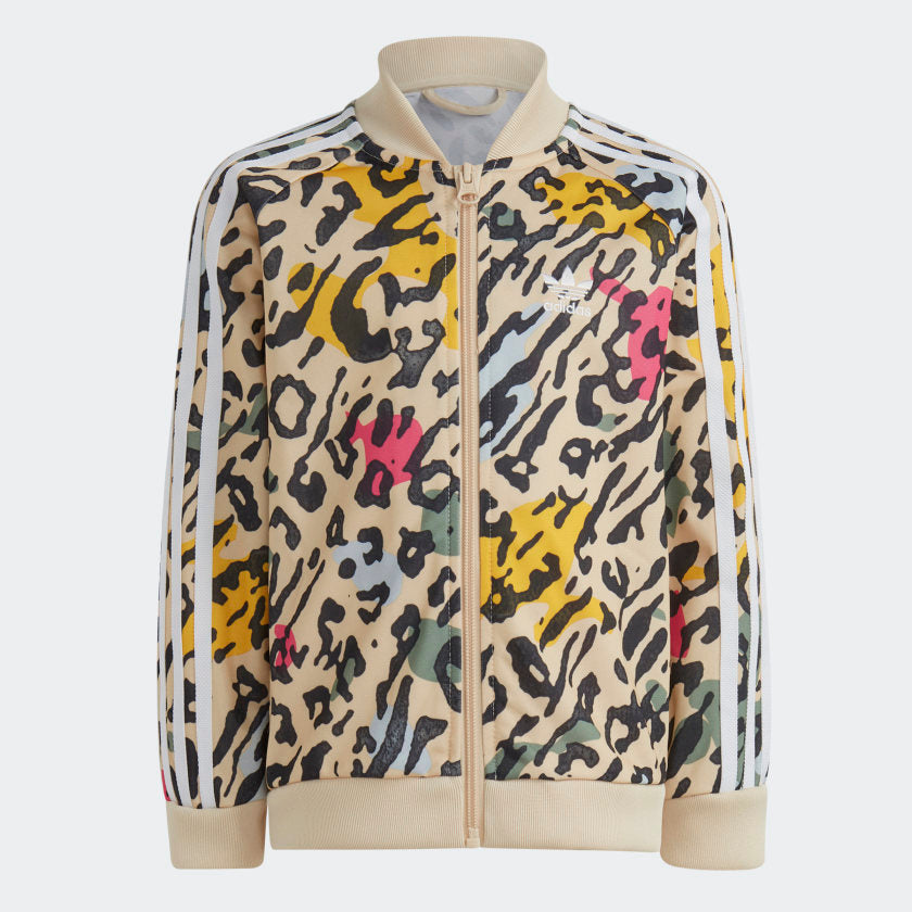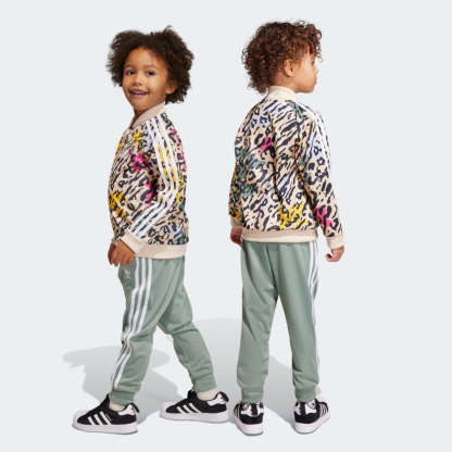 We all have a wild side. This kids' set just shows it off. A vibrant '80s-inspired animal print brings on the energy, and signature 3-Stripes keep things authentic adithtdas. Let's not forget the smooth tricot fabric that makes this set perfectly comfy for both life's quiet moments and wild ones. Made with 100% recycled materials, this product represents just one of our solutions to help end plastic waste.