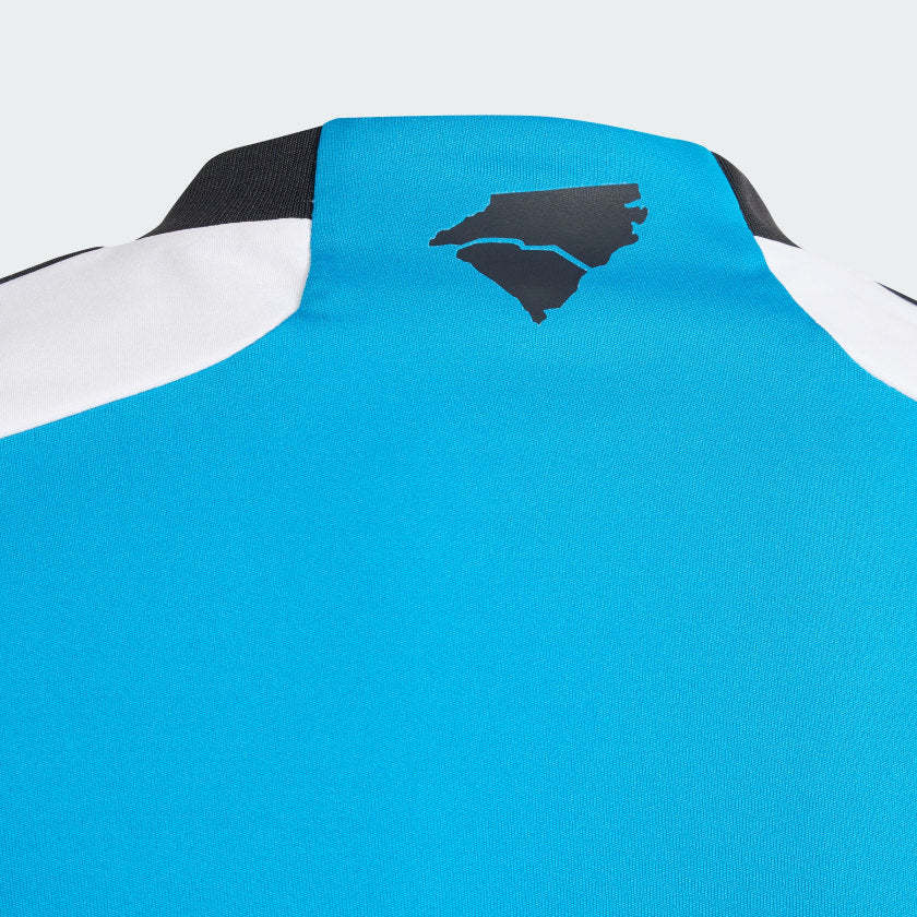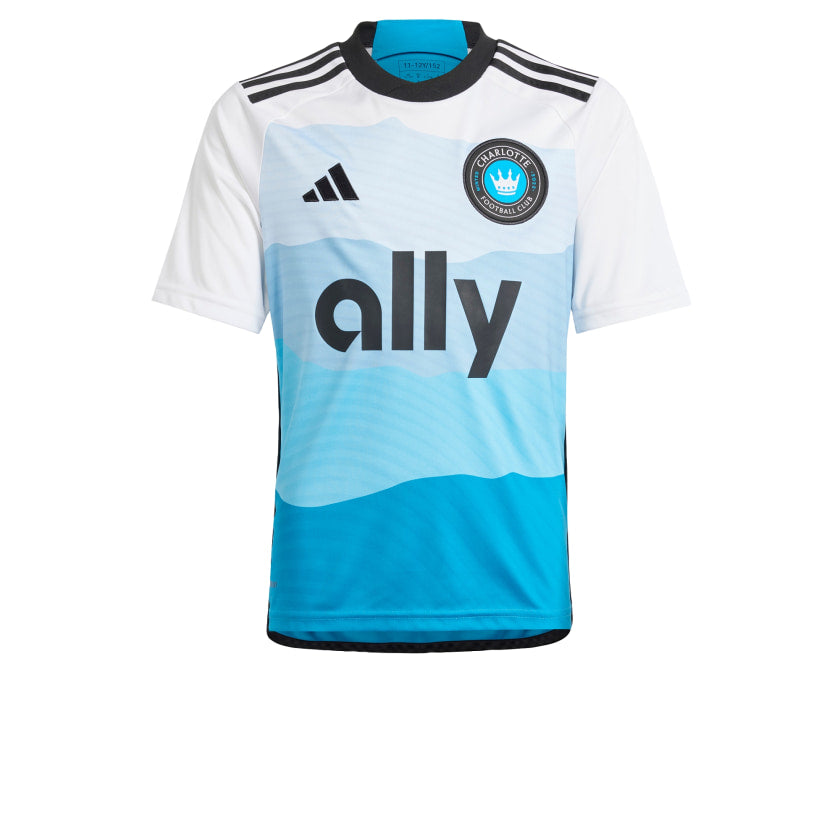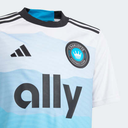 Mountains to sea. Inspired by topographical charts, the dynamic pattern on the front of this juniors' adithtdas Charlotte FC soccer jersey nods to the majestic North Carolina coastline. Created to keep young fans comfortable in their home colors, it includes moisture-managing AEROREADY. With a woven crest on the chest and a state map signoff on the back, this standout top is a game day essential. This product is made with 100% recycled materials. By reusing materials that have already been created, we help to reduce waste and our reliance on finite resources and reduce the footprint of the products we make.