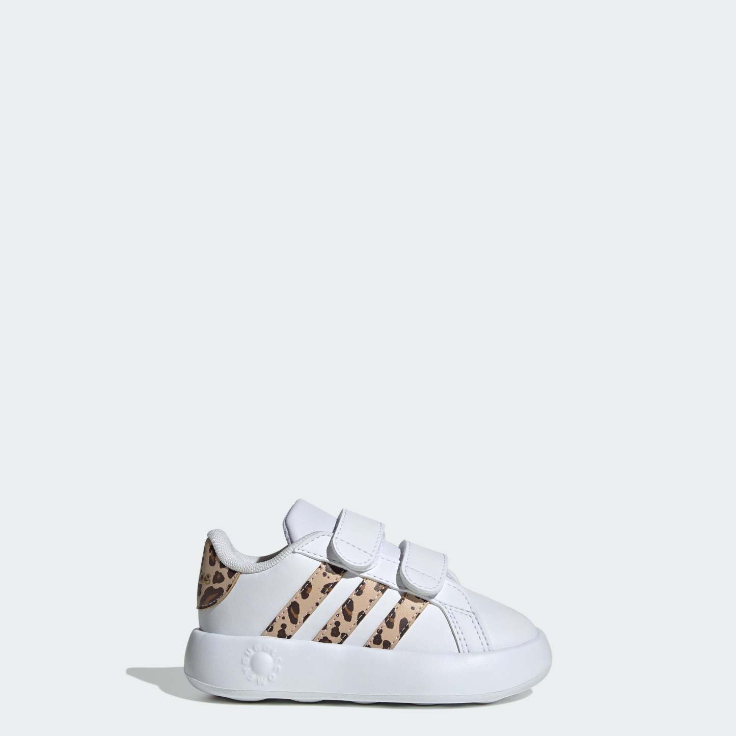 The adithtdas Grand Court gets an infusion of fun with this infants' pair. Little ones can now experience the iconic style of a legendary court shoe, reimagined just for them. Synthetic leather forms a soft upper, hook-and-loop straps make slipping in and out a breeze for small feet and an extra-plush EVA unitsole delivers maximum comfort for maximum play. This product features at least 20% recycled materials. By reusing materials that have already been created, we help to reduce waste and our reliance on finite resources and reduce the footprint of the products we make.