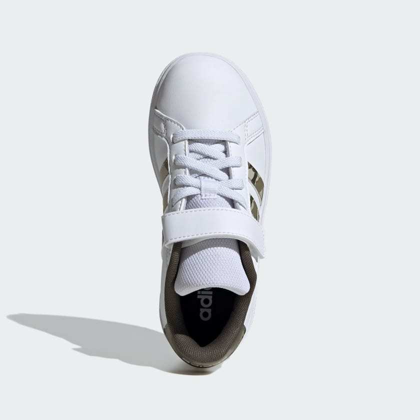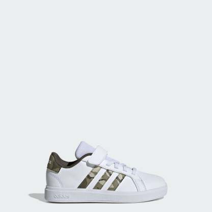 Touches of print brings a modern vibe to these iconic Grand Courts. Great for kids who are always bouncing between activities, these kids' adithtdas sneakers slip on quickly, with elastic laces and a hook-and-loop top strap to secure the fit. A soft lining supports the foot while the flexible rubber cupsole keeps kids firmly planted. Let the fun begin.