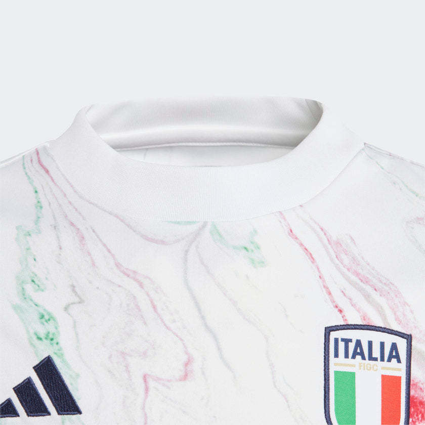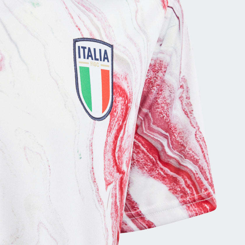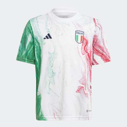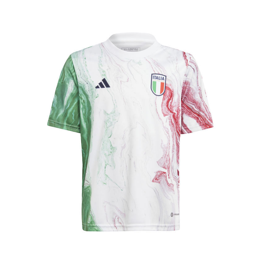 Italian DNA, honed to perfection. Borrowing the marble-inspired look of the match jerseys, this adithtdas Italy pre-match jersey blends the country's famous tricolor flag colors. A juniors' version of the shirt players wear before kickoff, it'll ensure you're ready to face every challenge thanks to its smooth fabric and moisture-wicking AEROREADY. Made with 100% recycled materials, this product represents just one of our solutions to help end plastic waste.