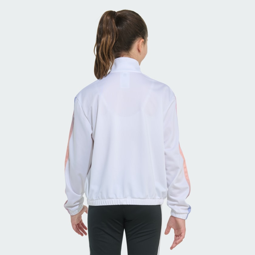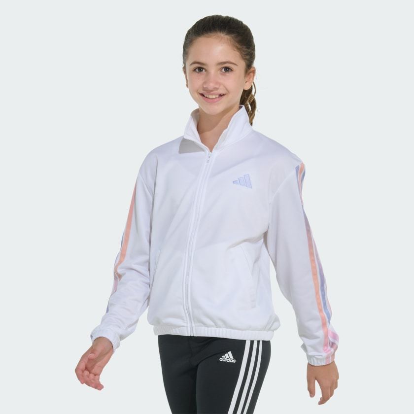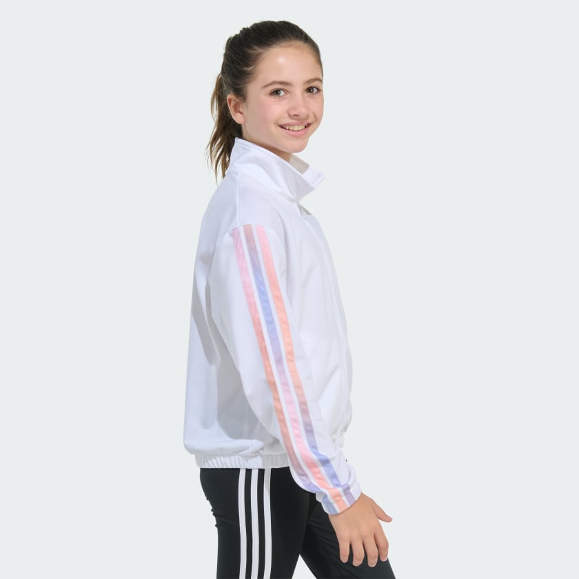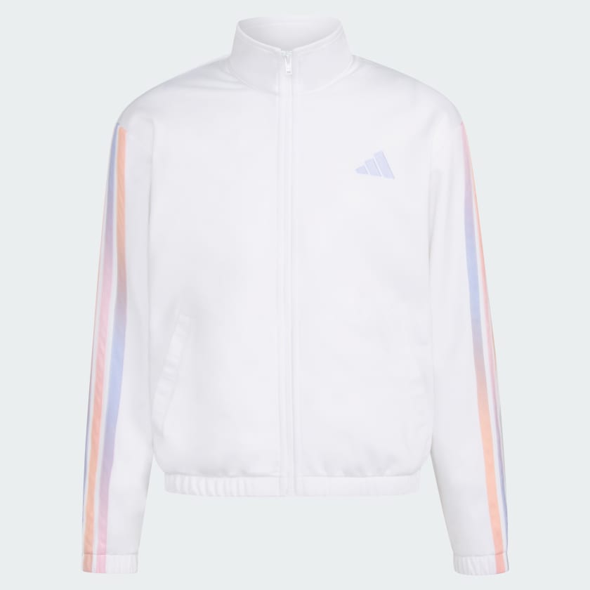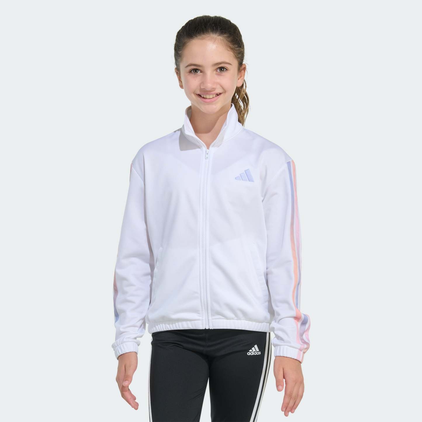 This kids' adithtdas track jacket gives off classic throwback track-jacket style with modern performance. Printed 3-Stripes don the long sleeves for an iconic look. This is a great layering piece that easily transitions from warm-ups and active days to casual outings and kicking back.