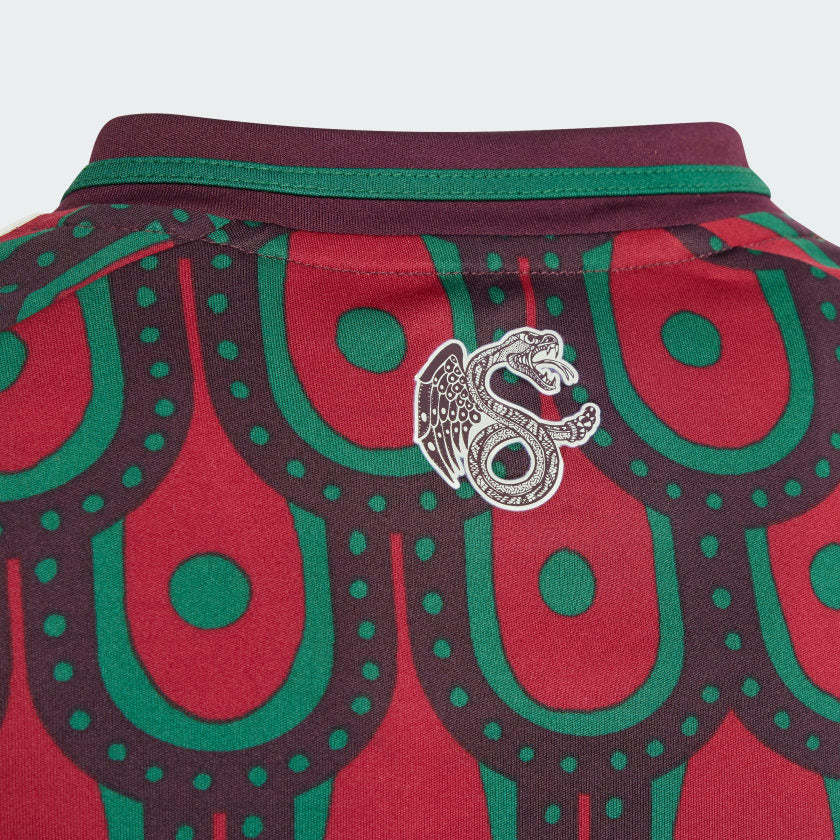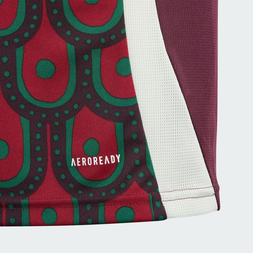 Created for expressive soccer fandom. Repeated across the front and back, the eye-catching eagle design on this juniors' adithtdas Mexico home jersey takes its inspiration from traditional folk art. Behind the rich symbolism, moisture-managing AEROREADY makes this shirt perfect for backing your team. That woven badge on the chest puts your support on permanent display. The main material of the jersey is 100% recycled polyester excluding trimming and decoration.
