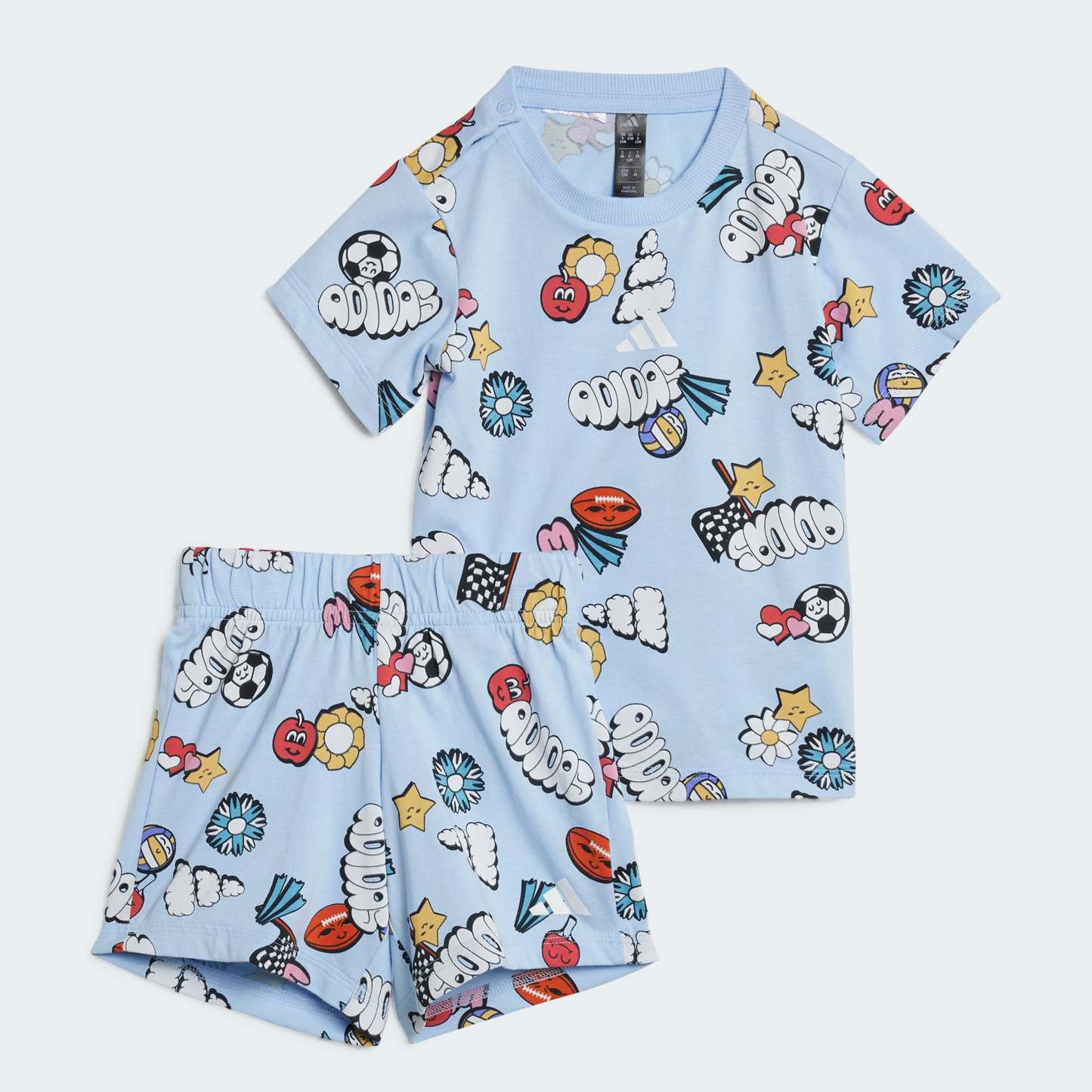 Crafted for comfort and designed for fun, this infants' adithtdas tee-and-shorts set brings a playful vibe to any day. The soft single jersey build keeps your little one comfortable whether they're exploring the world or settling in for a story. The bold, colorful, allover print is sure to spark joy and imagination with every wear. By choosing recycled, we are able to reuse materials that have already been created, which helps to reduce waste. Renewable materials choices will help us to remove our reliance on finite resources. Our products made with a blend of recycled and renewable materials feature at least 70% total of these materials.