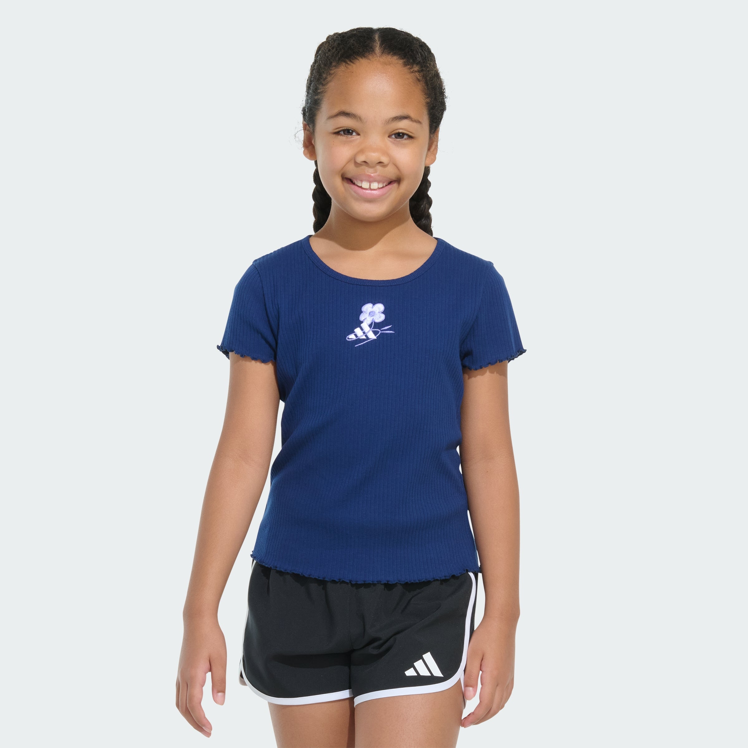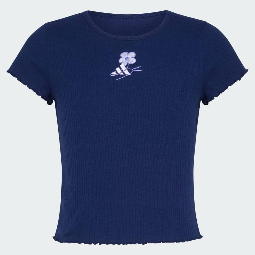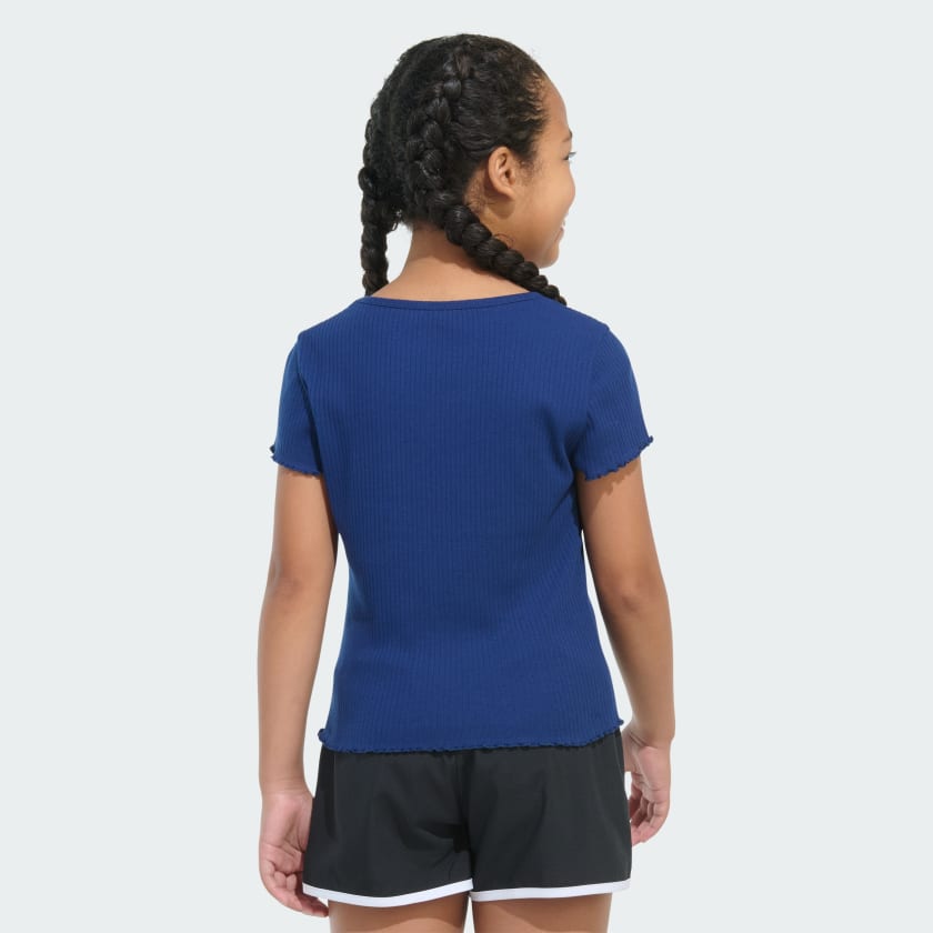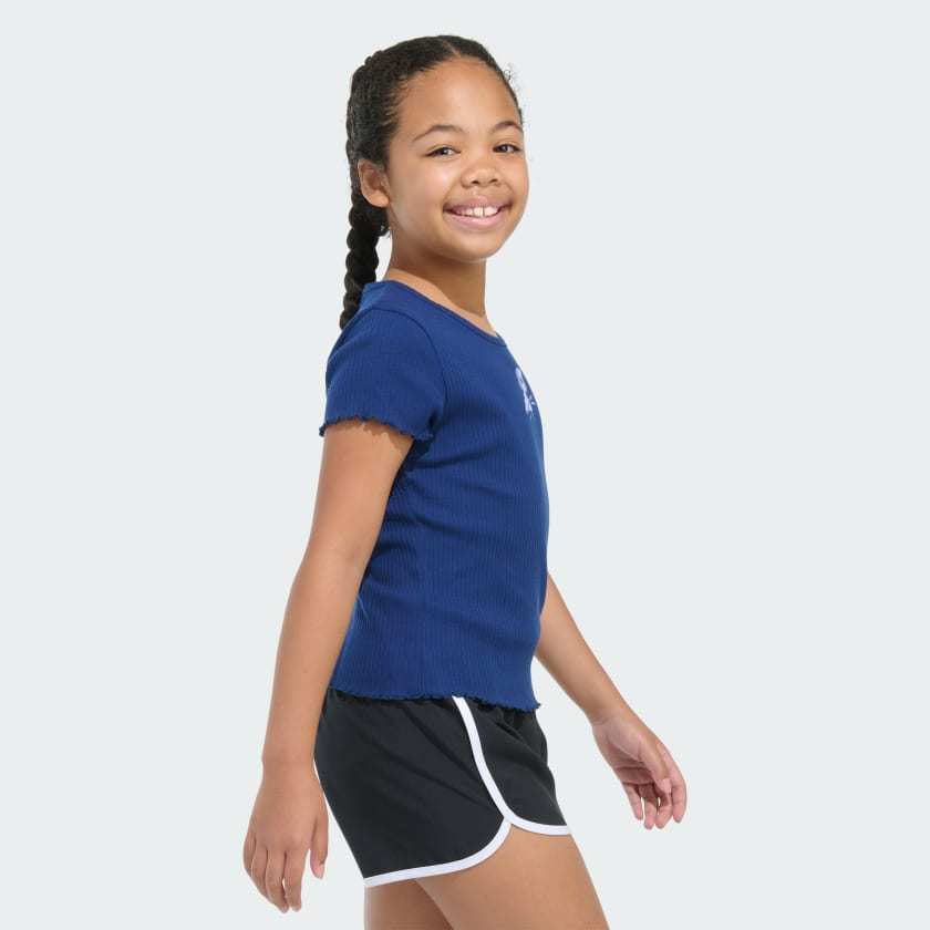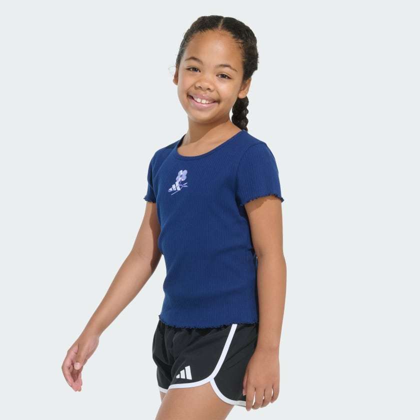 This kids' t-shirt pairs up perfectly with their positive vibes. Delicate designs and an embroidered adithtdas 3-Bar logo elevate it just enough. Lettuce edges on the cap sleeves and hem finish the look.