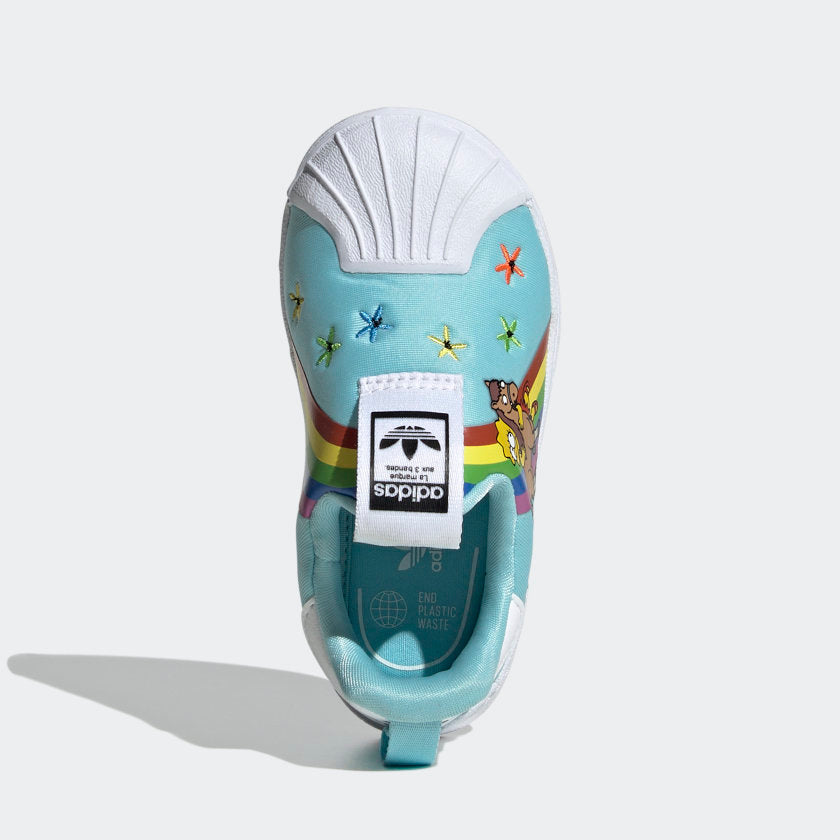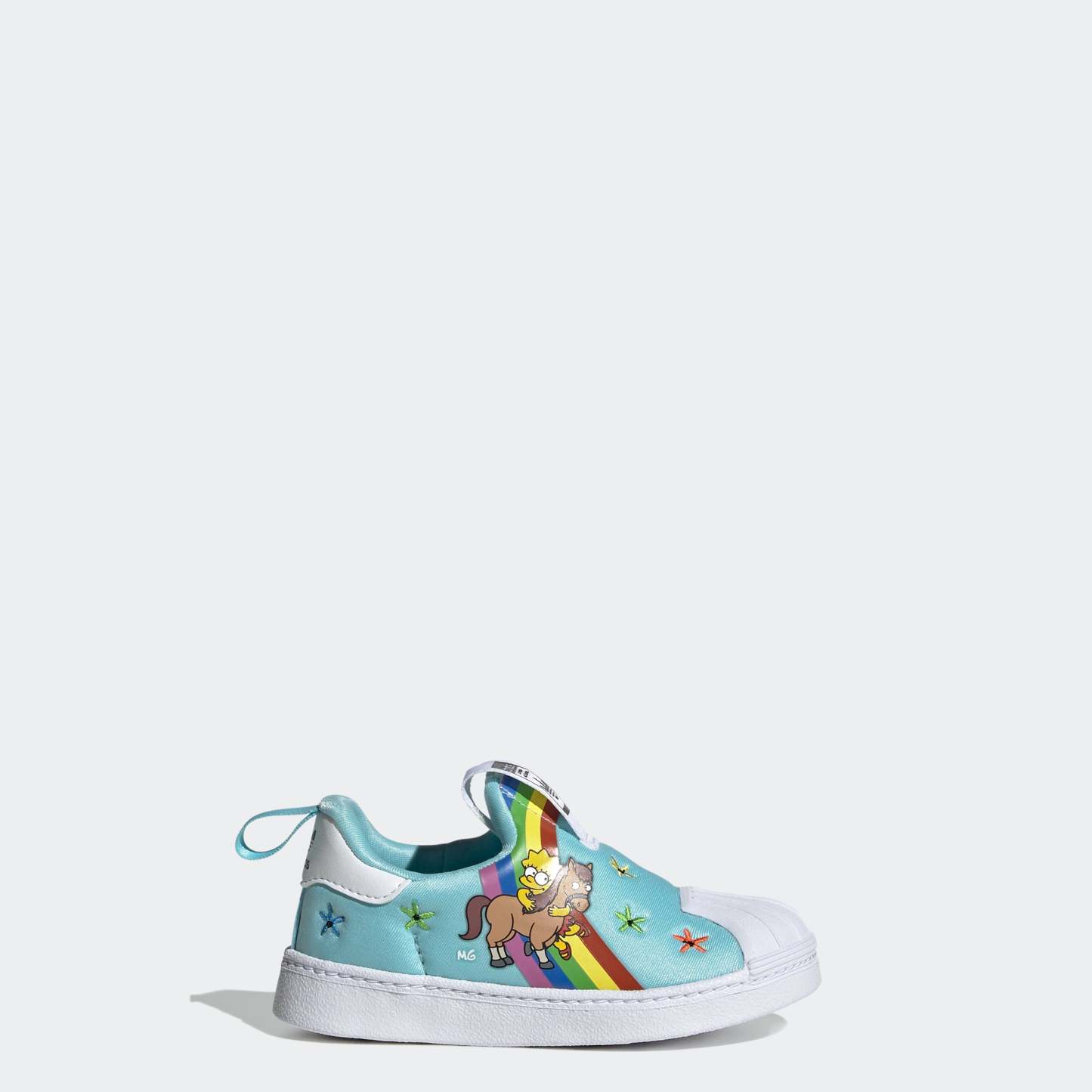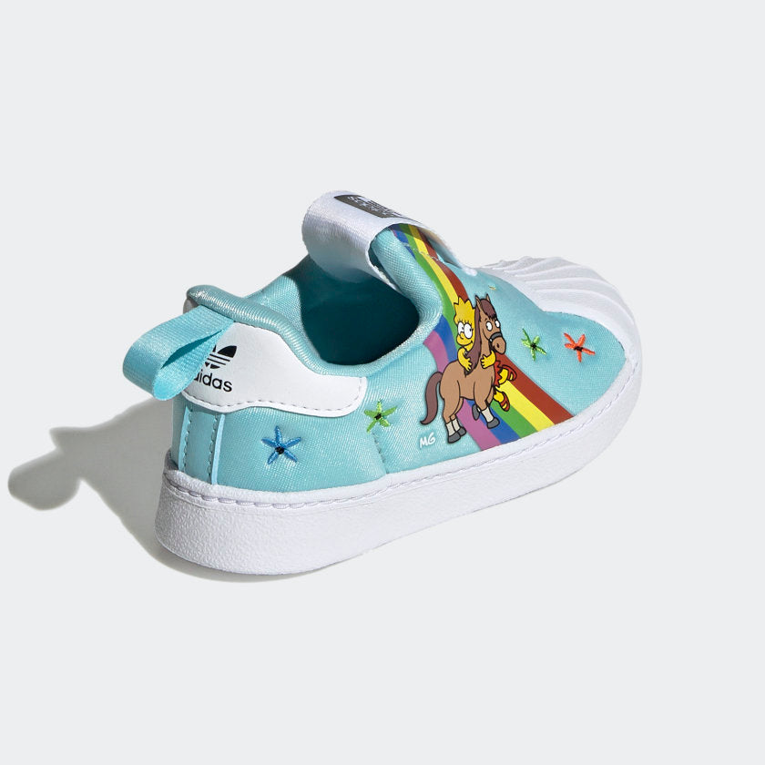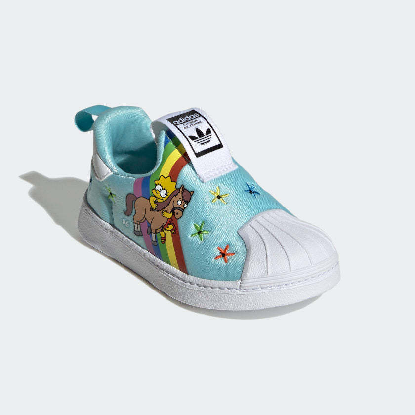 Two cultural icons in one place. Lisa Simpson and her beloved pony (for one whole episode) embrace on the colorful upper of these toddlers' adithtdas Superstar shoes, surrounded by rainbows and flowers to really emphasize the love. The slip-on design makes them easy to get on and off in the rush of the day, and the soft, one-piece EVA midsole keeps little ones comfortable throughout it all. Made with a series of recycled materials, this upper features at least 50% recycled content. This product represents just one of our solutions to help end plastic waste.
