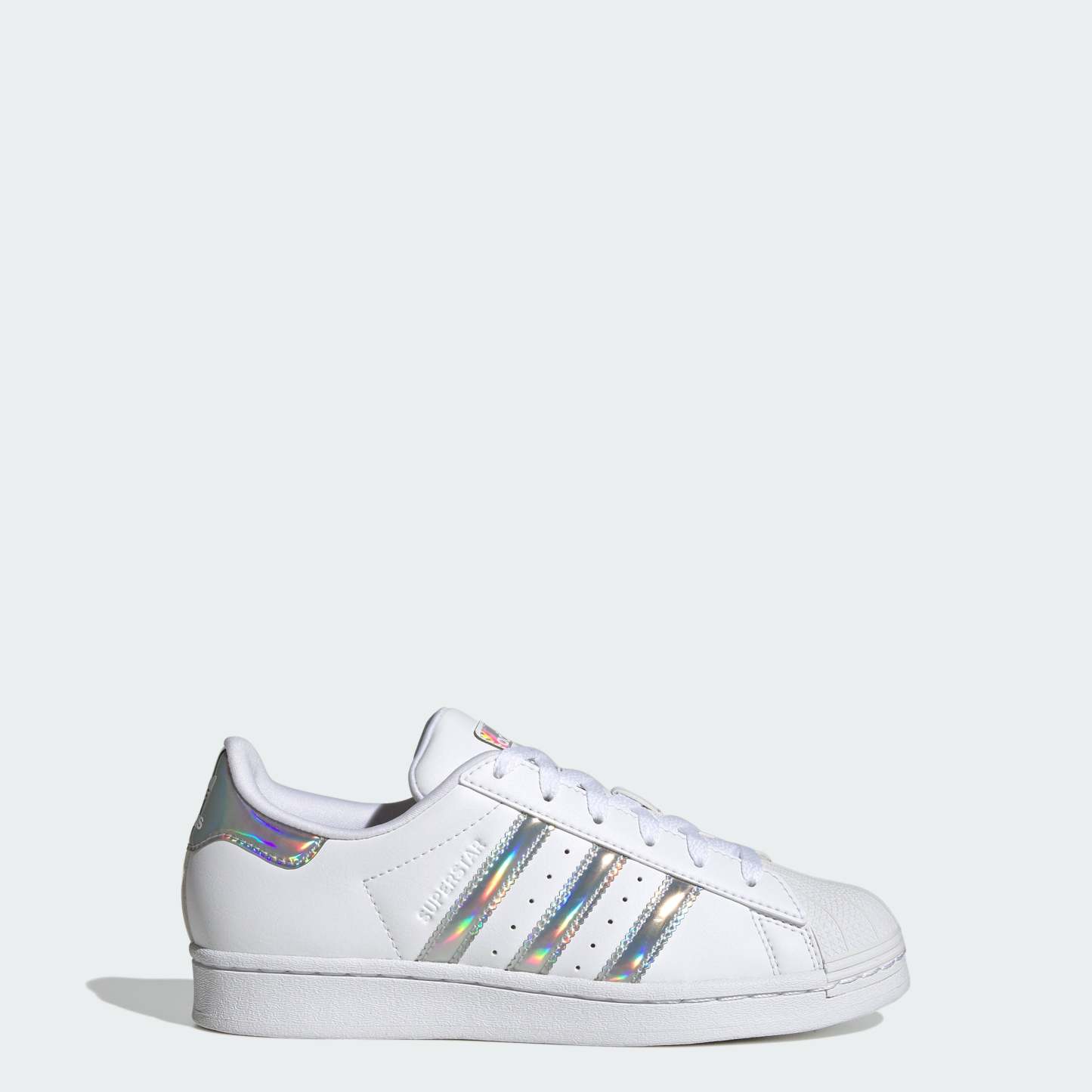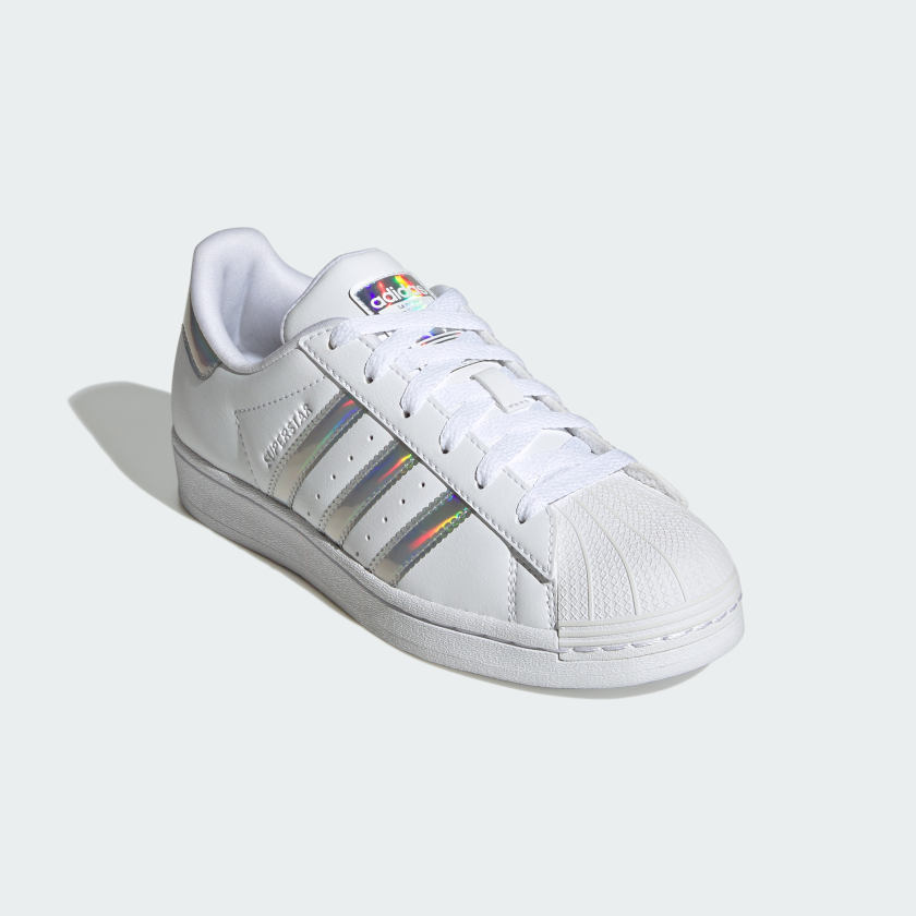 One of the easiest ways to express yourself is to have fun with your style. These juniors' adithtdas Superstar shoes have just the right amount of flash to elevate your look. The smooth leather upper and iconic shell toe ground this look in its fashion heritage, while iridescent accents give it an attitude all its own. Slide these on and let your shoes do all the talking. Made with a series of recycled materials, this upper features at least 50% recycled content. This product represents just one of our solutions to help end plastic waste.