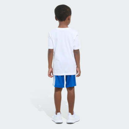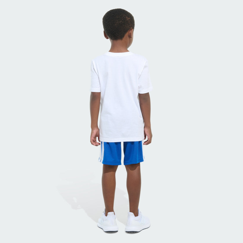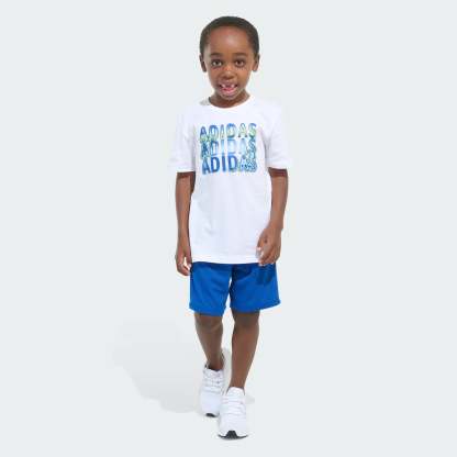 Set your little athlete free to play hard and work on their moves. This adithtdas two-piece set for kids includes a classic crewneck tee with sport-centric graphics and 3-Stripes shorts with a stretchy waist. Both pieces are made from fabrics that are soft on their skin and easy to clean.