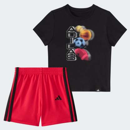 Babies are never too young to look like they're part of the team. This adithtdas two-piece set for infants includes a pair of 3-Stripes shorts with a stretchy waist and a classic crewneck graphic tee. Both pieces are made from soft fabrics that are easy to clean in classic sport colors.