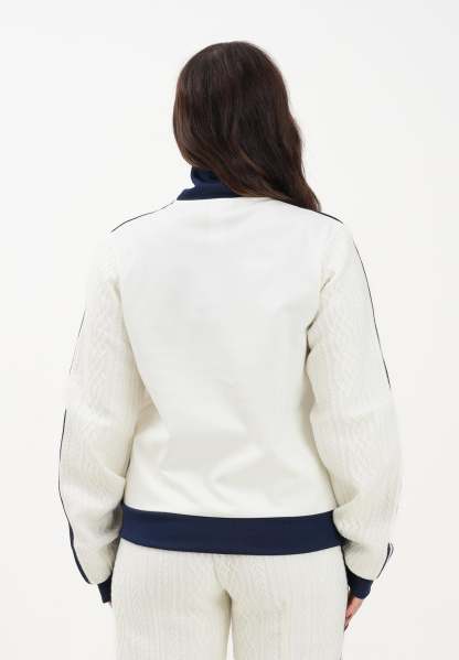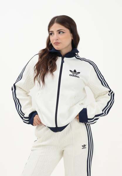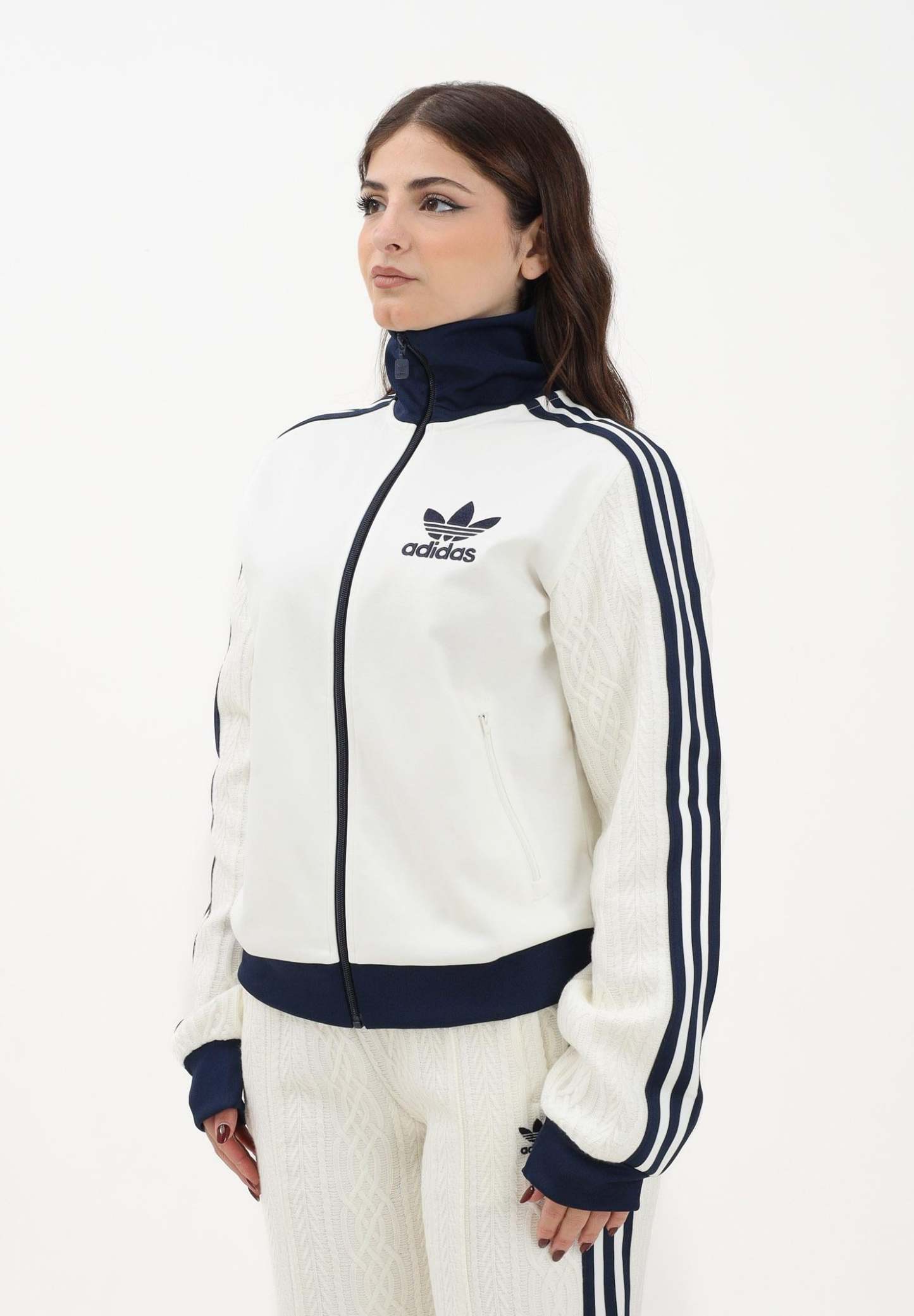 Adithtdas Women's Knit Classic Zip-Up Hoodie in Cream. The Adithtdas Knit Classic Track Top is designed to keep you warm in the colder months. With its knitted construction and cable-knit sleeves, it offers a premium look and feel. The regular fit and center-front zip make this top easy to layer over your favorite outfits. A zippered pocket keeps essentials safe and secure when you're on the go. Whether you're heading out for the day or warming up at home, the Adithtdas iconic knitted track jacket is the ideal choice for effortless style. The model wears a size S and is 170 cm tall. Hand wash and medium ironing are recommended. Fall/Winter season.