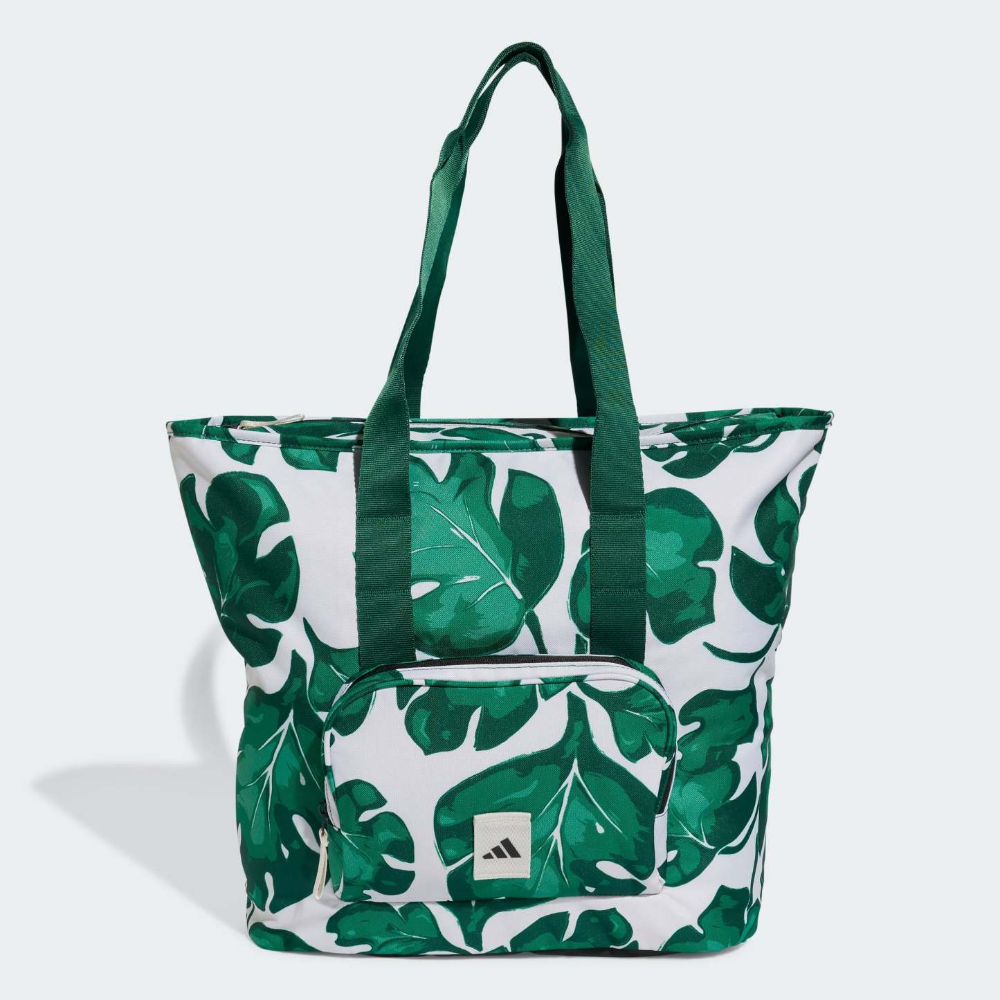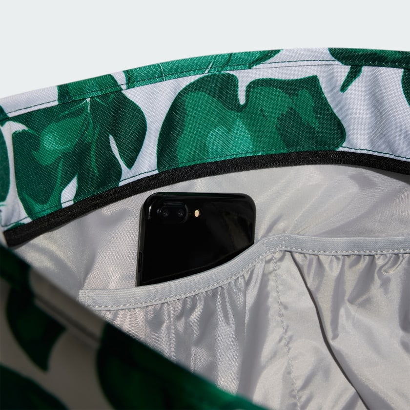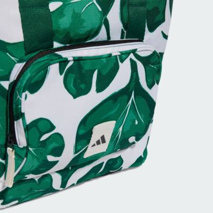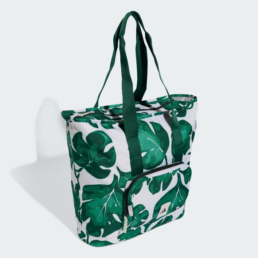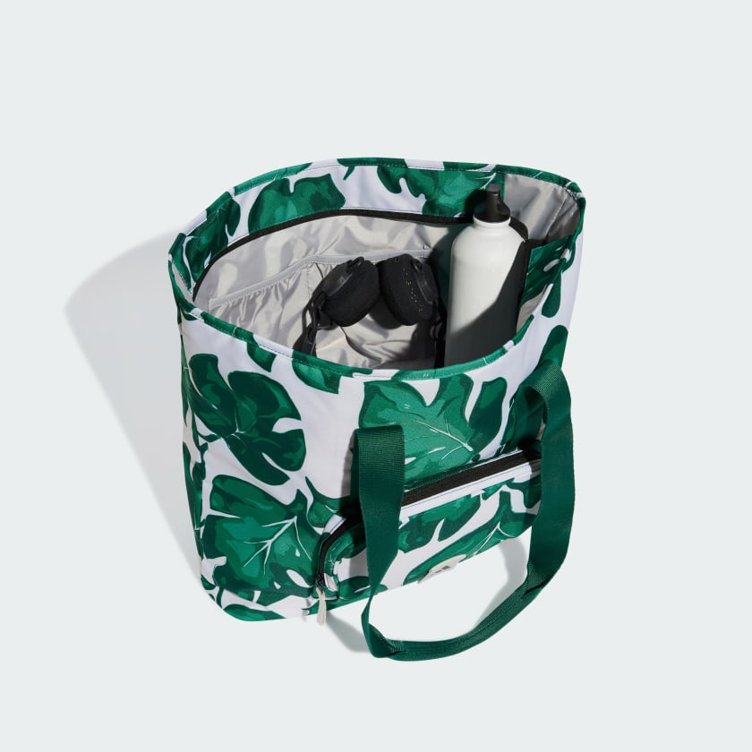 An adithtdas tote bag designed for life on the go. The polyester plain weave build is durable for everyday use, with a stylish leaf print that adds a pop of personality. Perfect for carrying your workout gear or weekend essentials, this bag lets you tote it all in style. This product is made with at least 50% recycled materials. By reusing materials that have already been created, we help to reduce waste and our reliance on finite resources and reduce the footprint of the products we make.
