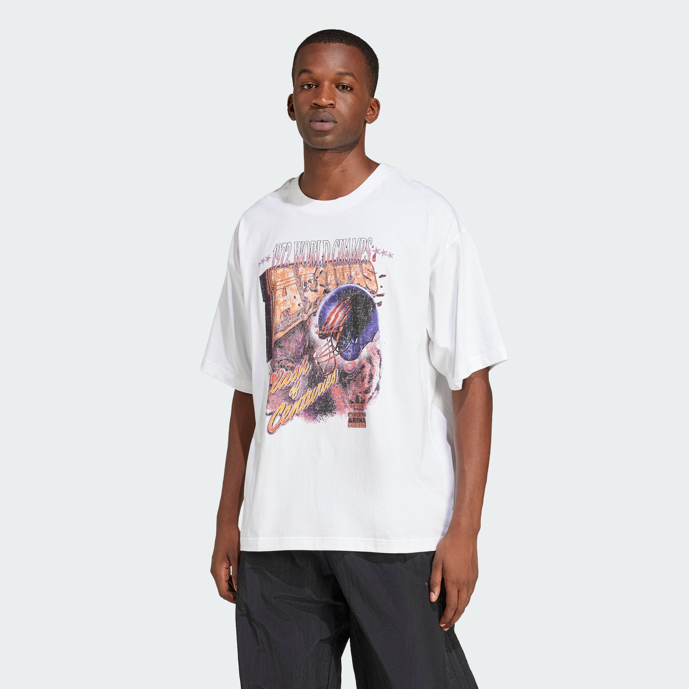 With sports, comes fans, and this adithtdas t-shirt embraces that energetic side of the culture with a bold graphic on the front. The colors and graphics create a nostalgic narrative centered around football. It has a vintage, washed look and feel - like a pristine shirt that made it through the decades.