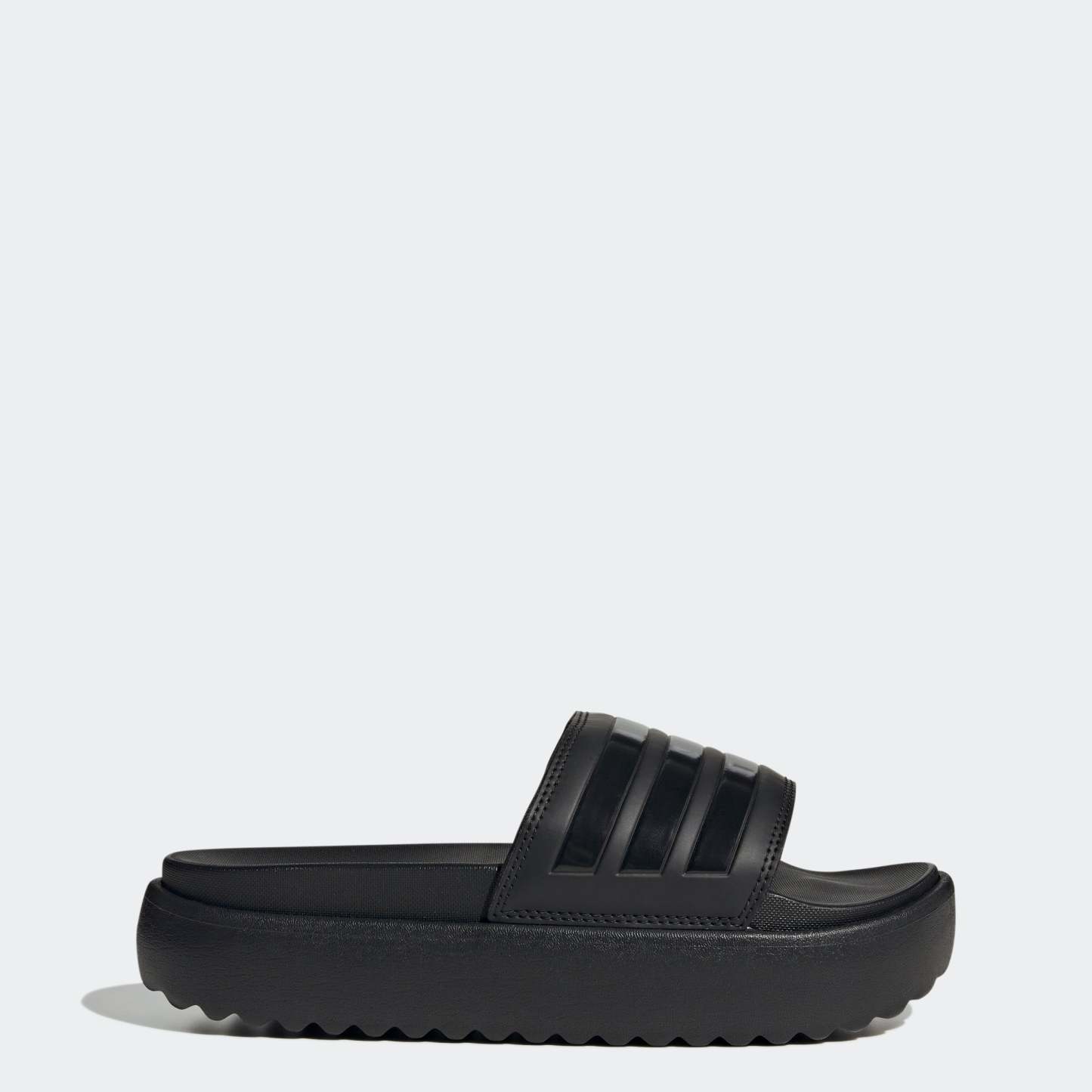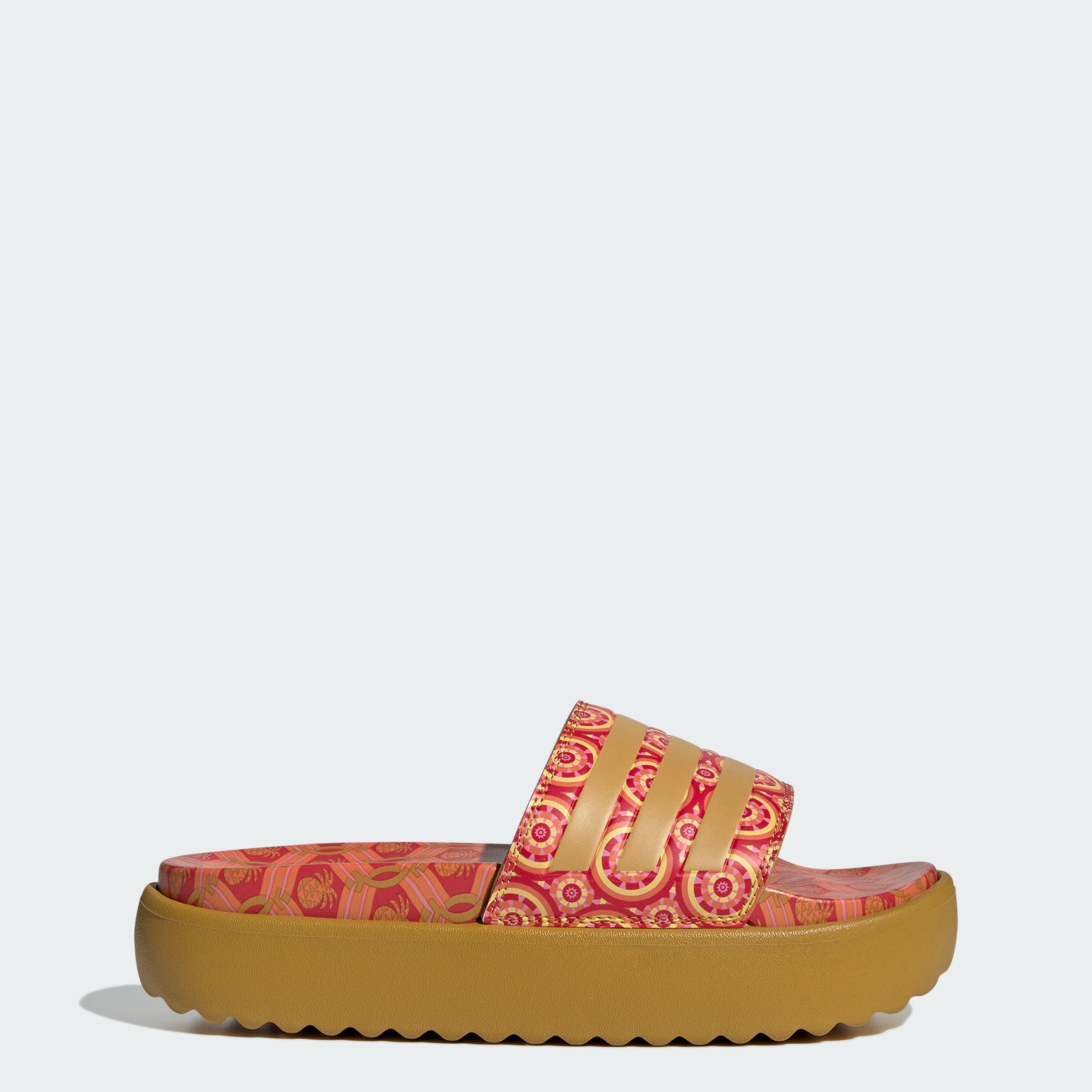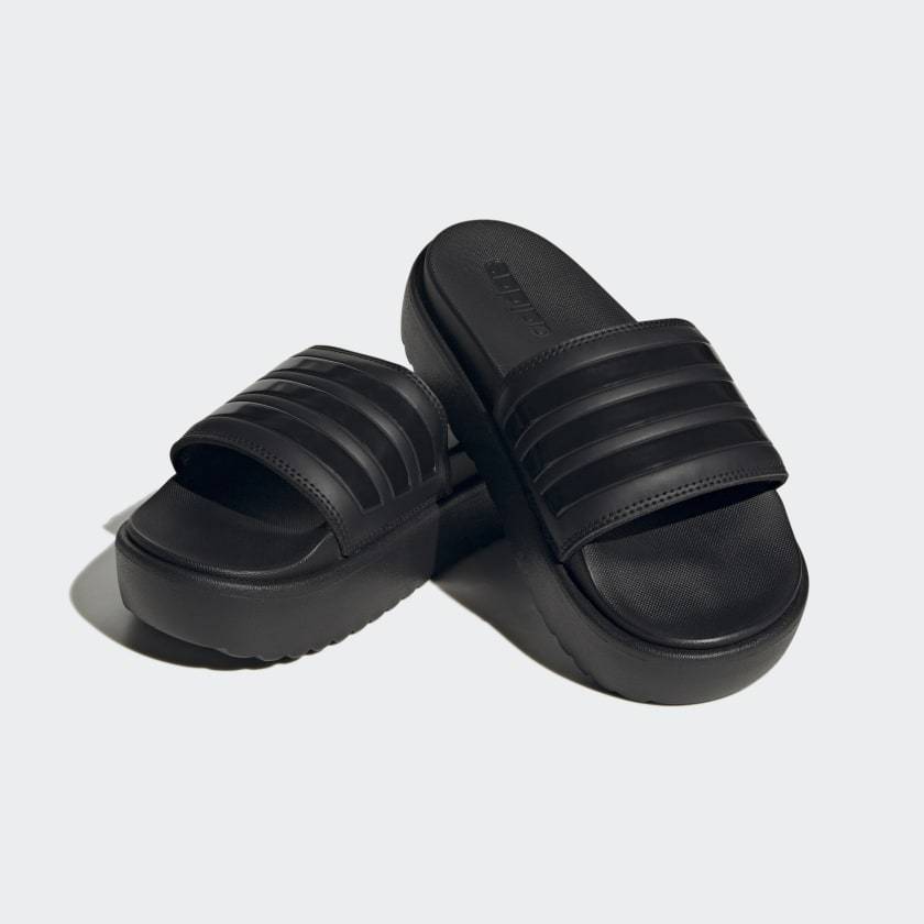 The coolest way to show off your pedicure. These adithtdas platform slides look at home by the pool and in the city with 3-Stripes wrapped around the smooth bandage uppers. These sandals have a contoured footbed and a cushioned EVA outsole for maximum comfort.