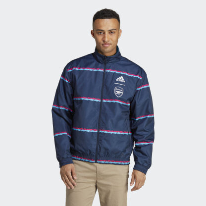 Show you're Arsenal through and through. This adithtdas soccer jacket is the one the club's players wear in pre-match lineups. Its reversible design includes two match wear-inspired looks - one with a woven badge and the other showing off a printed one. Smooth fabric keeps you comfortable, whichever side of your fandom you put on display.