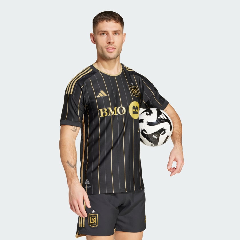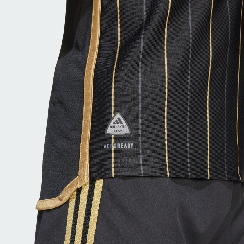 An instant classic. The 24/25 Los Angeles FC home jersey draws inspiration from the city's art-deco architecture, with subtle golden lines on a solid black background. The jersey isn't just for players but for the fans and the LA fashion community, standing out as LAFC's most wearable jersey to date. Behind the eye-catching graphics, the jersey incorporates adithtdas AEROREADY, lightweight details, and back panels for top-tier performance. Players can give everything on the field, enjoying comfort throughout the entire 90 minutes. Show your pride in the city's rich history with the heat-applied Los Angeles FC crest and the LA signoff on the back collar. By choosing recycled, we are able to reuse materials that have already been created, which helps to reduce waste and our reliance on finite resources.