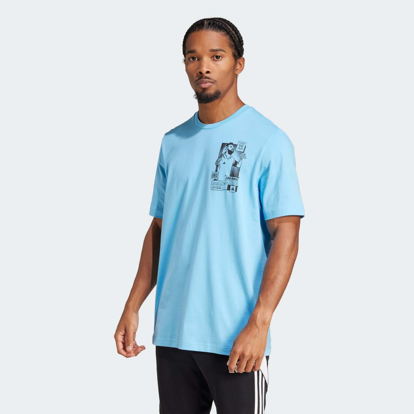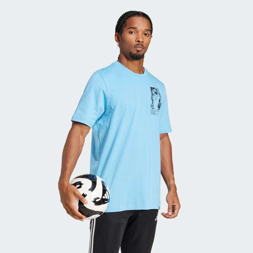 Channel the magic of soccer's GOAT in an adithtdas tee that displays Messi's famous goal celebrations. Featuring comic-inspired artwork on the front and back, this top will keep you standing out from the crowd. Its soft cotton build ensures you stay comfortable while you represent.