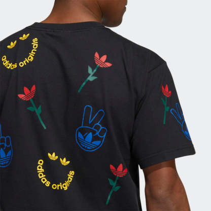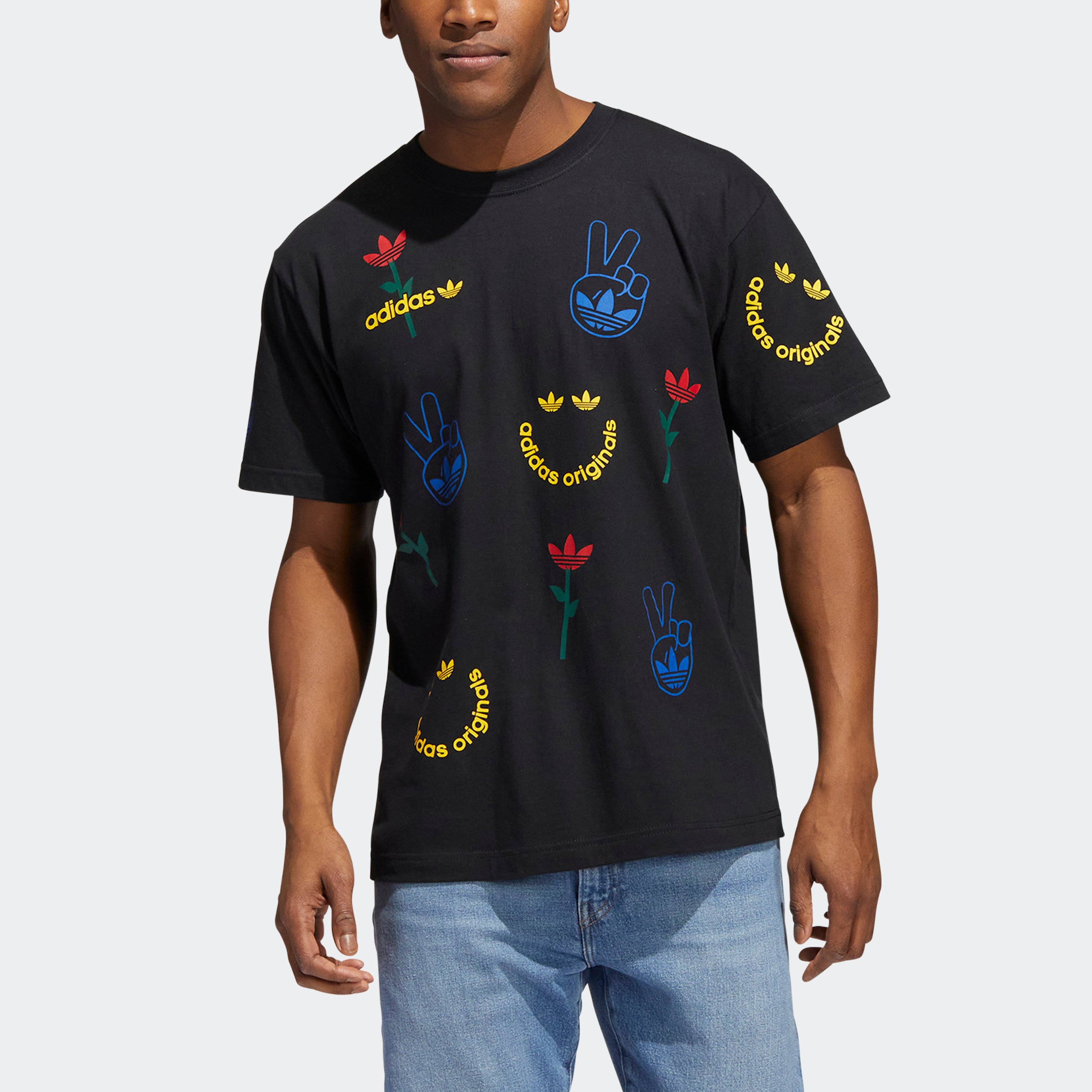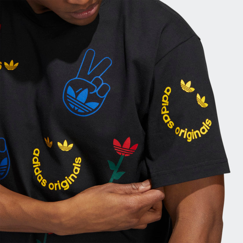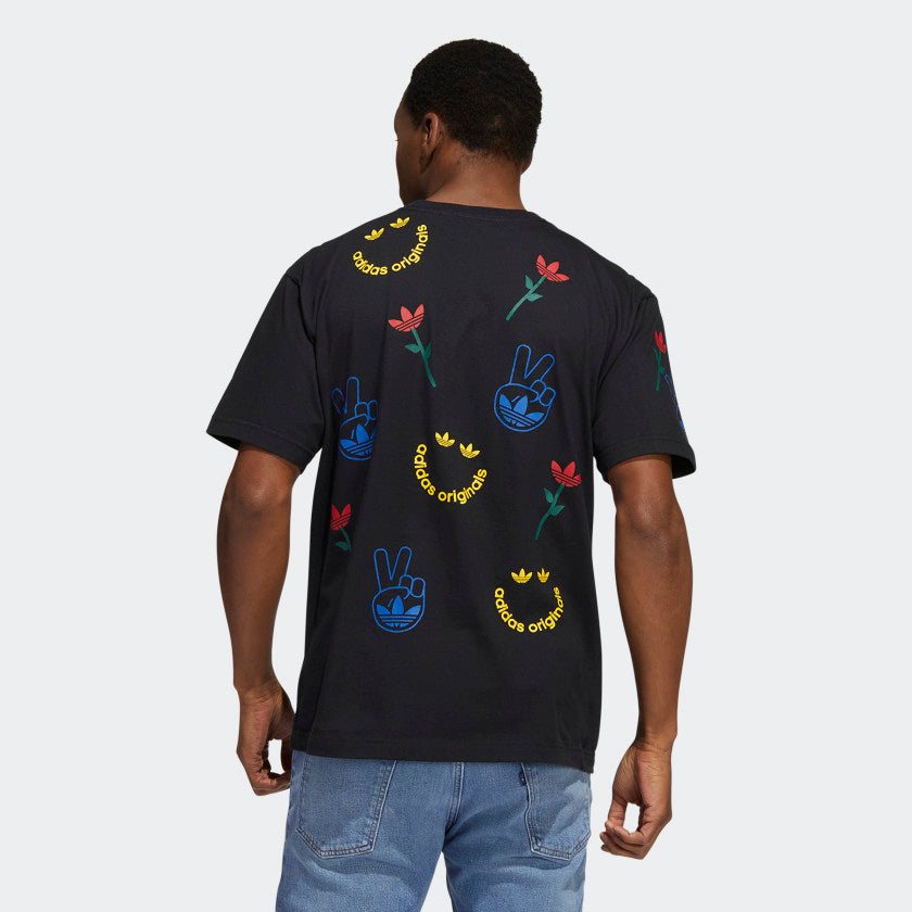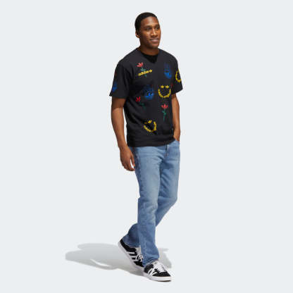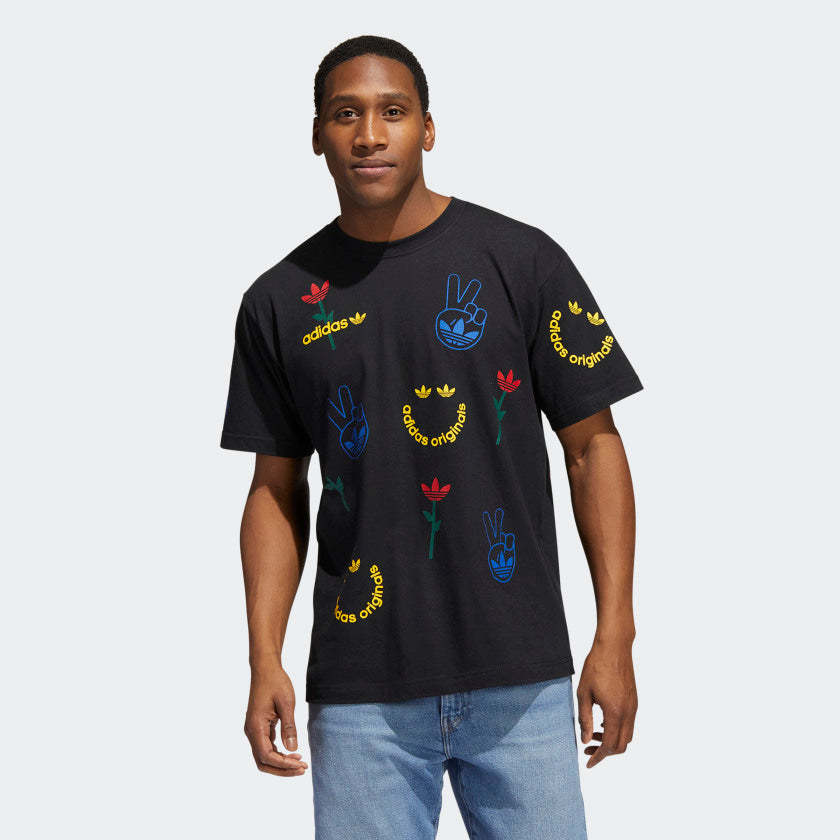 How you start off the morning sets the foundation for the rest of the day. Kick things off with this adithtdas t-shirt. It's pure vibes and positive energy. Flowers, peace signs, adithtdas-themed smiley faces. You're set in soft cotton for all-day comfort. Our cotton products support more sustainable cotton farming.