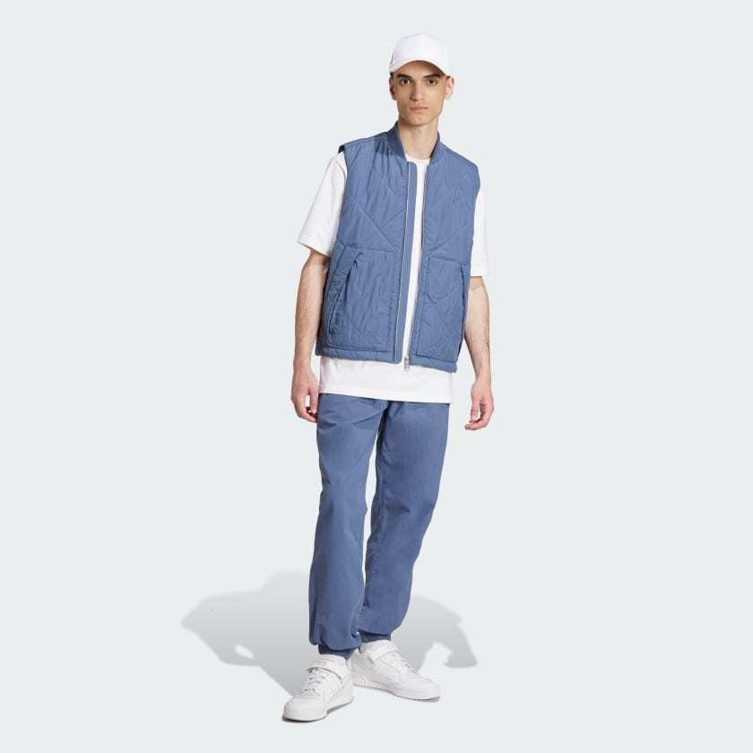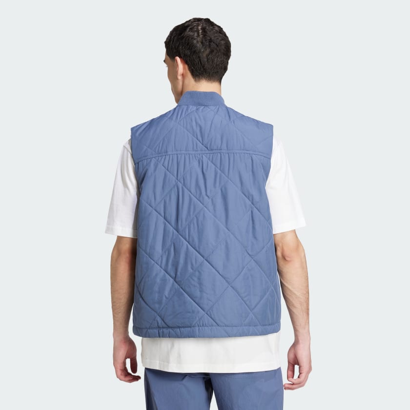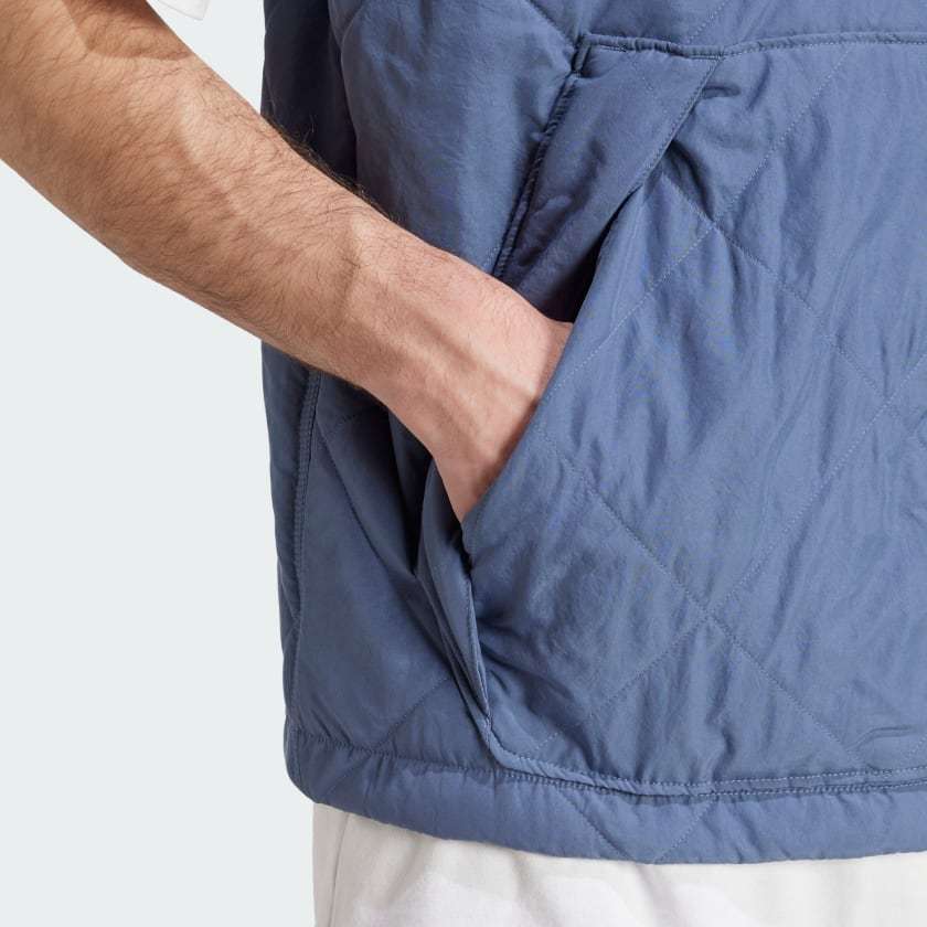 Your new favorite layer. Stay cozy during cool weather in this adithtdas quilted vest. Lightweight padding and a ribbed collar combine to block the chill on breezy days while roomy pockets provide space to warm your hands. A small Trefoil on the chest connects you to a legacy of pioneering sportswear. In a regular fit that's not too tight but not too loose, this vest layers easily over tees and under jackets for versatile warmth.
