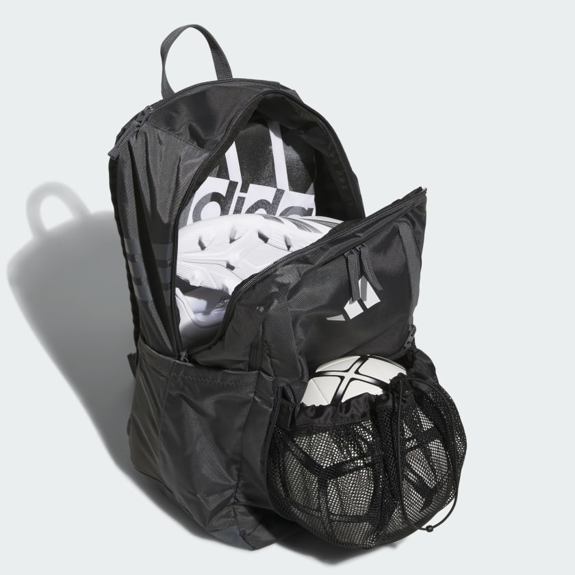 Made from lightweight, durable polyester, this versatile adithtdas backpack keeps stuff organized and dry thanks to a water-resistant base. Multiple zip pockets keep your gear separated, including one that can hold a size 5 soccer ball and two mesh side pockets that can each hold a 32 oz water bottle. There's also a vented pocket to store dirty gear and a clip to attach essentials. Score!