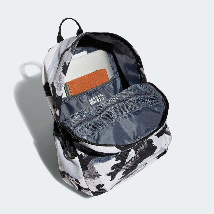 Carry your whole world with you. Everything from your laptop to earbuds to a change of clothes fits neatly inside this adithtdas backpack. And even with all that stuffed inside, all anyone will see is your effortless sense of style. The Trefoil logo is the first detail to catch the eye, reflecting your originality. Made in part with recycled content generated from production waste, e.g. cutting scraps, and post-consumer household waste to avoid the larger environmental impact of producing virgin content.