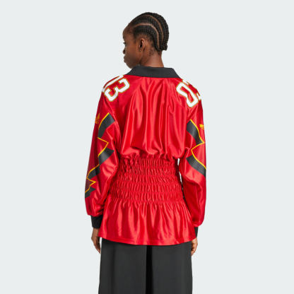 A flip of the script on what's expected, this adithtdas jersey takes a familiar silhouette and injects it with some femme energy. The inspiration is football - made clear from the premium graphic execution and collar. The waist gets cinched, though, with detailed ruching that brings in the shape and emphasizes the voluminous sleeves.