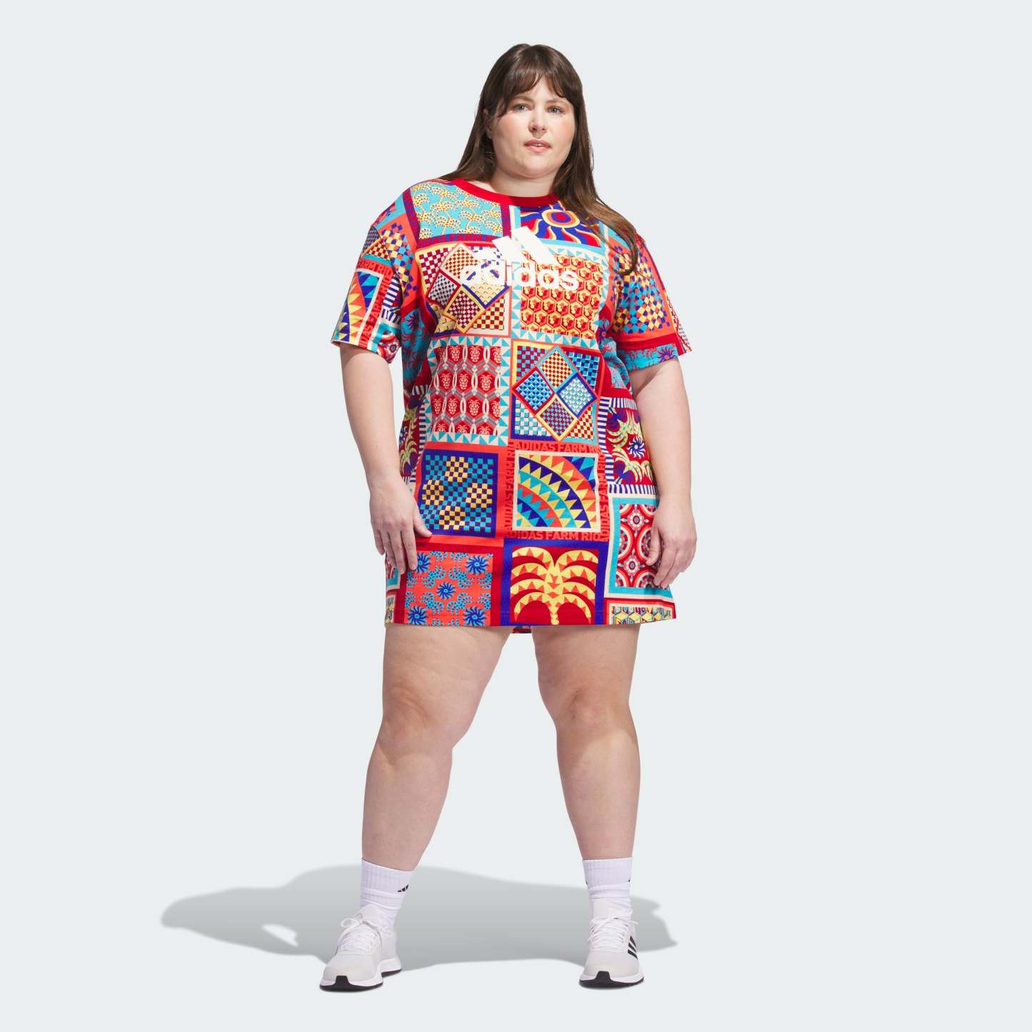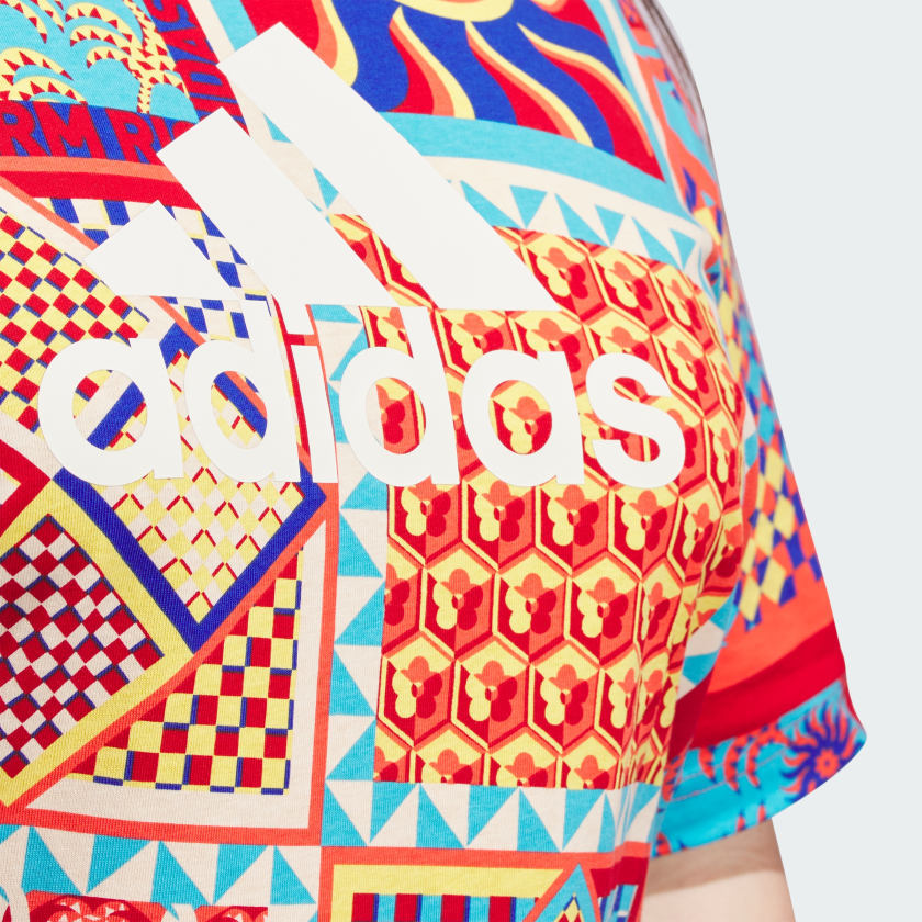 A modern remix of Brazil's vibrant spirit. This adithtdas x FARM dress moves with you from sun-drenched beaches to festivals. Taking cues from Rio's mosaic sidewalks and lapping waves, the kaleidoscopic print pops with lush colors and undulating shapes. Made for life on the go, this soft, slim-fitting dress is easy-going yet full of energy. The cotton in this product has been sourced through Better Cotton. Better Cotton is sourced via a chain of custody model called mass balance. This means that Better Cotton is not physically traceable to end products. Find out more here - https - //bettercotton.org/who-we-are/our-logo/